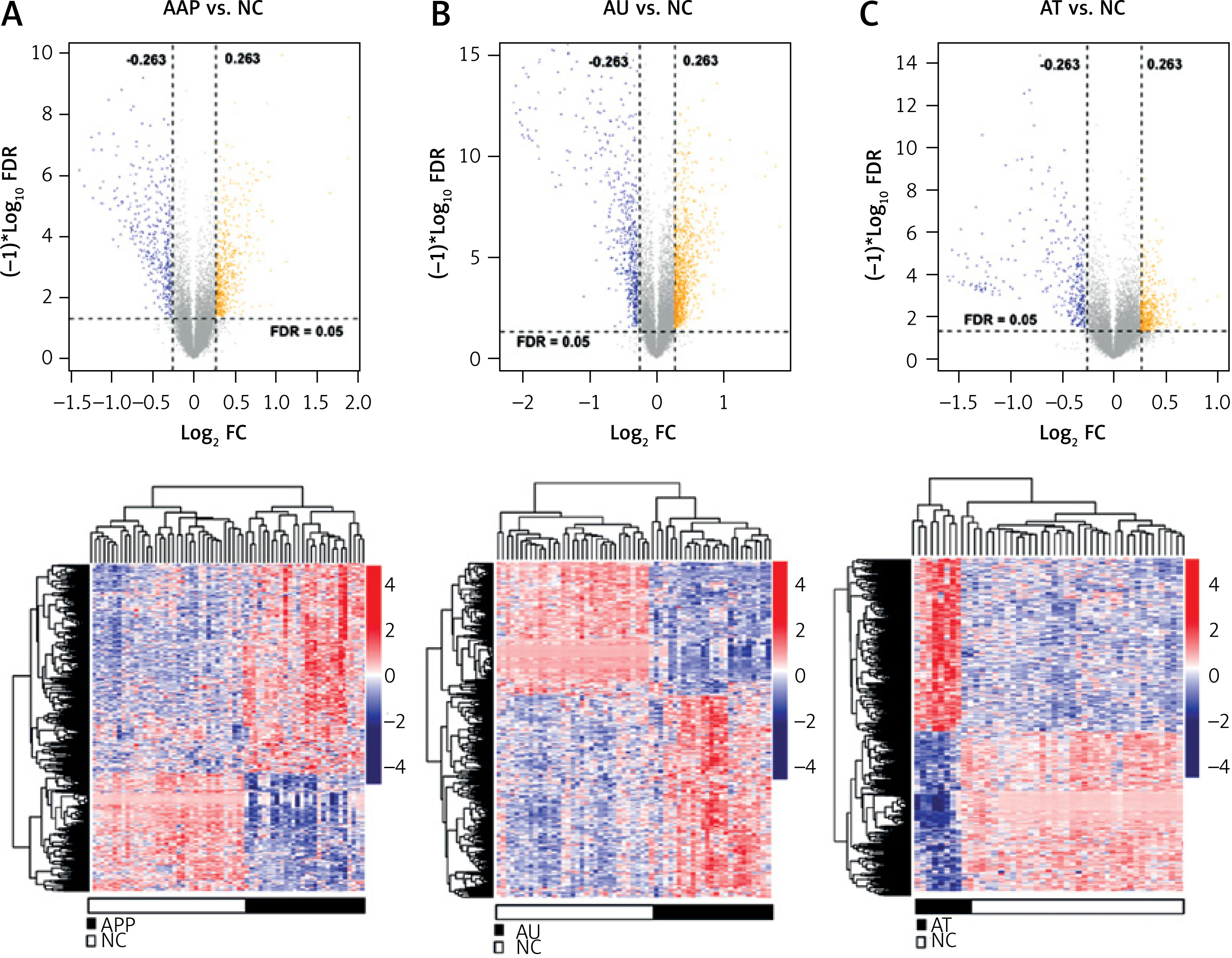 Volcano map and heat map of differentially expressed RNAs (DERs) of patchy-type AA (AAP) vs. normal controls (NC) (A), alopecia universalis (AU) vs. NC (B), and alopecia totalis (AT) vs. NC (C). Above map: volcano map. Blue and orange dots indicate significantly down-regulated and up-regulated DERs, respectively. The horizontal dashed line indicates FDR < 0.05, and the vertical dashed line indicates |log2FC| > 0.263. Bottom map: two-way hierarchical clustering heat map based on the expression level of DERs