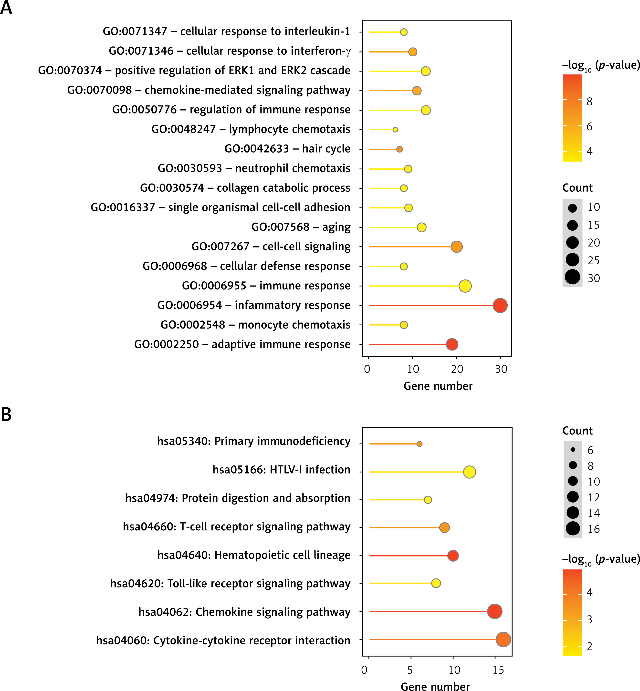 Dot plot of biological process (A) and Kyoto Encyclopedia of Genes and Genomes (KEGG) pathways (B) significantly enriched by overlapping differentially expressed RNAs. The horizontal axis represents the number of genes, the vertical axis represents the item name, the color represents significance, and the color closer to red represents the greater significance