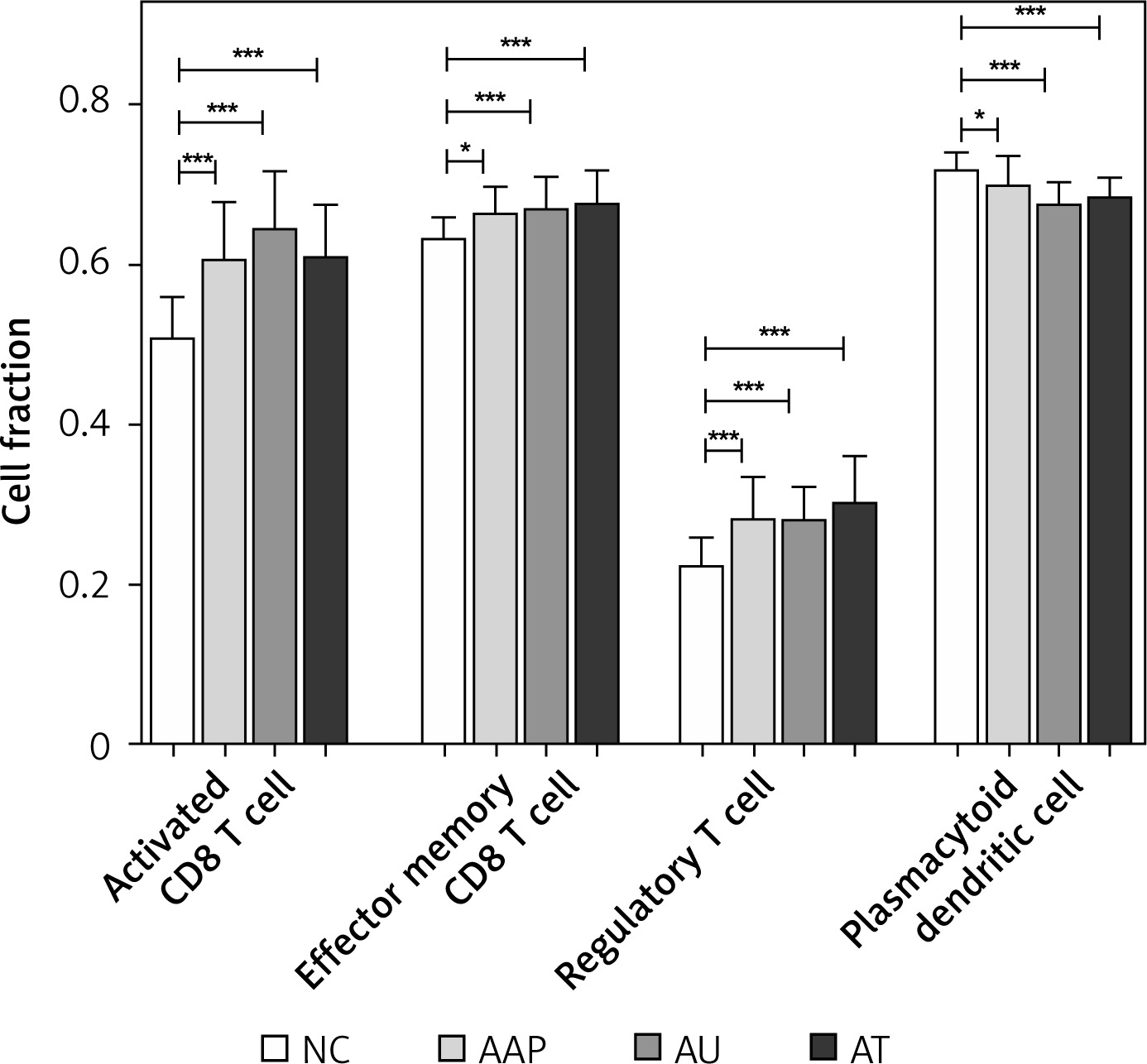 Utilizing ssGSEA, we identified 28 immune cell types associated with the three forms of AA. Subsequently, we compared the proportions of these immune cells across the three comparison groups. Significant differences in four immune cell types were observed compared to NC, including activated CD8 T cells, effector memory CD8 T cells, regulatory T cells, as well as plasmacytoid dendritic cells (Figure 3). Notably, three out of the four immune cells were T cells, indicating that AA is a lymphocyte-mediated autoimmune disorder.