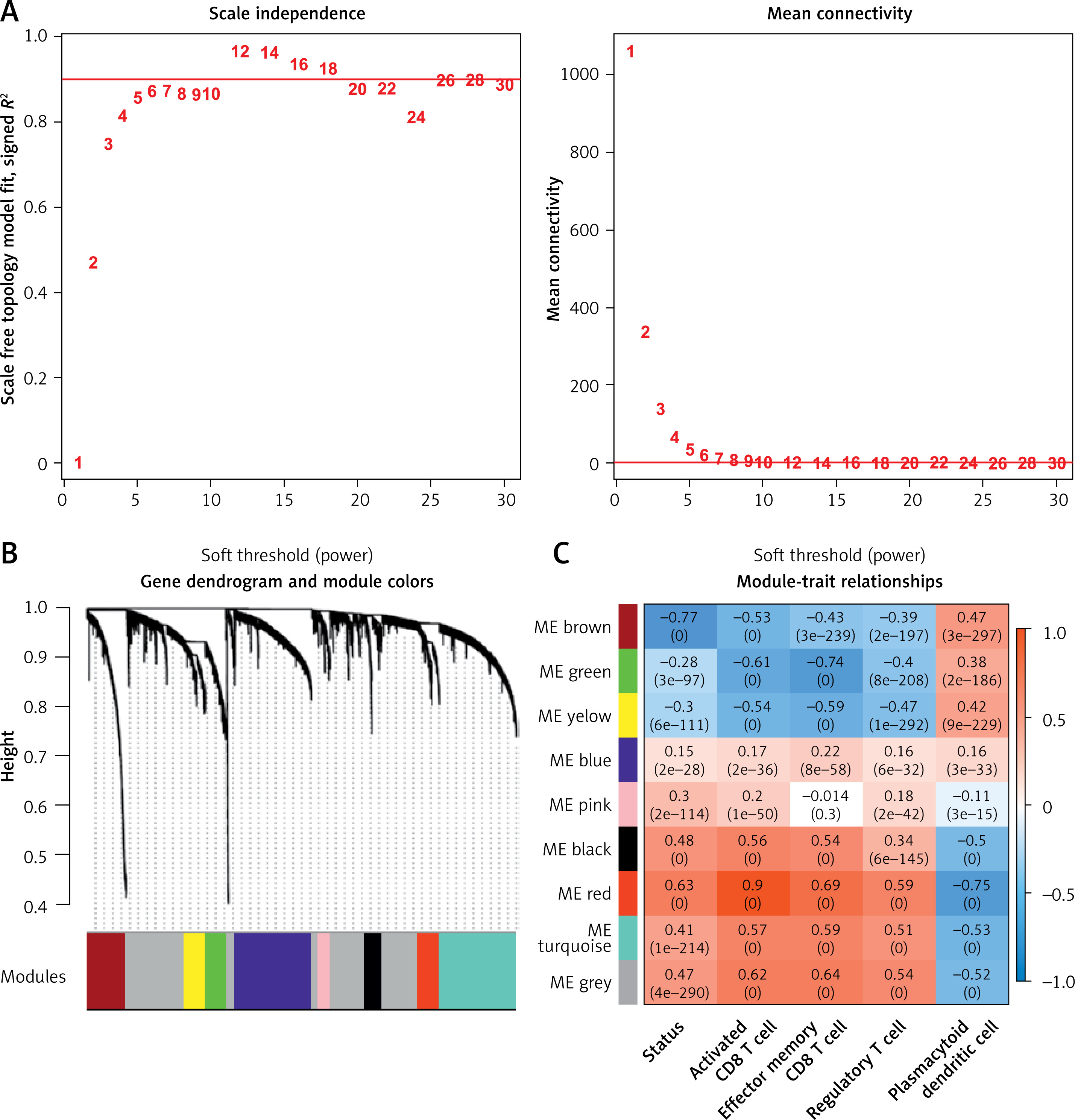 Identification and assessment of immune-related modules using WGCNA. A – Adjacency matrix weight parameter power selection graph and schematic diagram of the average connection degree of genes under different power parameters. In the left graph, the horizontal axis represents the weight parameter power, and the vertical axis represents the square of the correlation coefficient between log(k) and log(p(k)) in the corresponding network. The red line represents the standard line where the square value of the correlation coefficient reaches 0.9. In the right graph, the red line represents the value of the average connectivity of the network nodes under the value of the power parameter of the adjacency matrix in the left figure. B – Module division tree diagram. Each color represents a different module. C – Module-trait correlation heat map