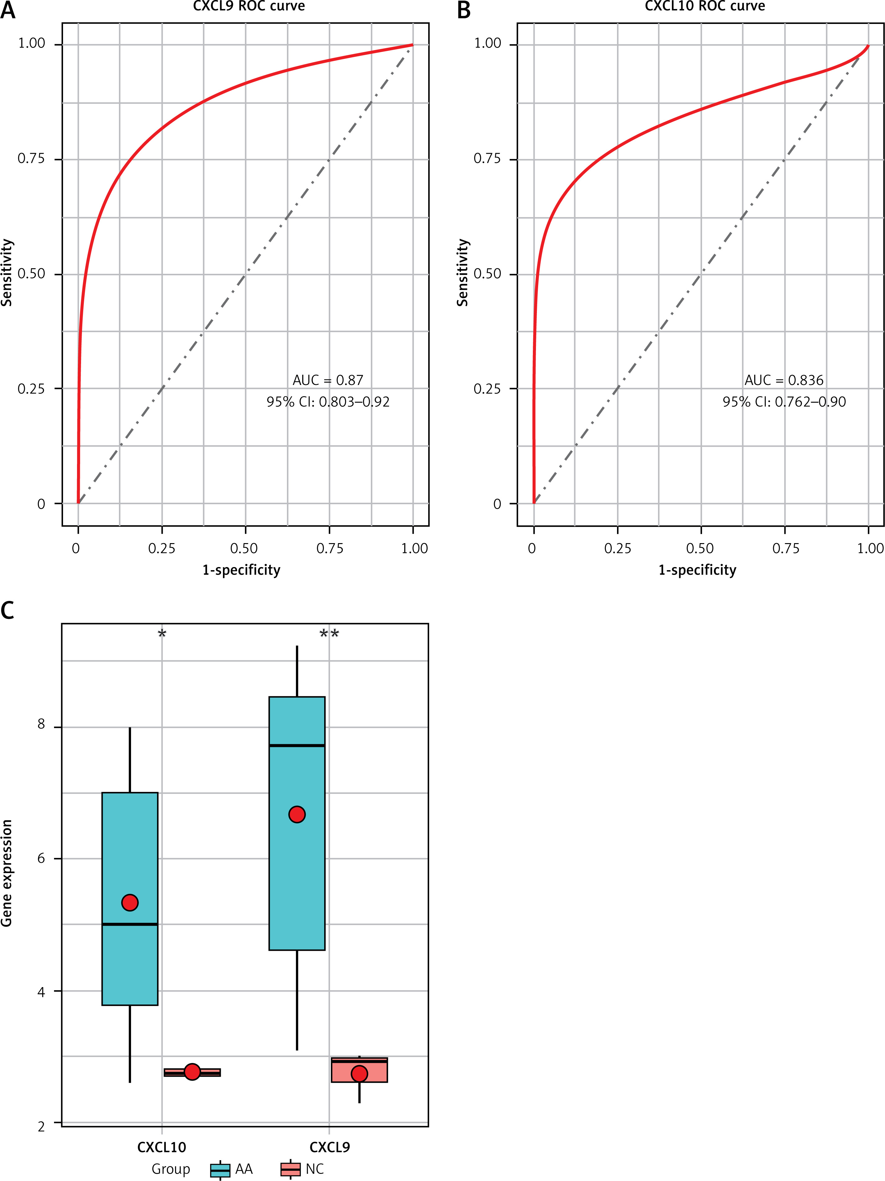 Validation of CXCL9 and CXCL10 as diagnostic markers in AA patients. A – ROC analysis of CXCL9 in GSE68801. B – ROC analysis of CXCL10 in GSE68801. C – Expression levels of CXCL9 and CXCL10 in GSE80342