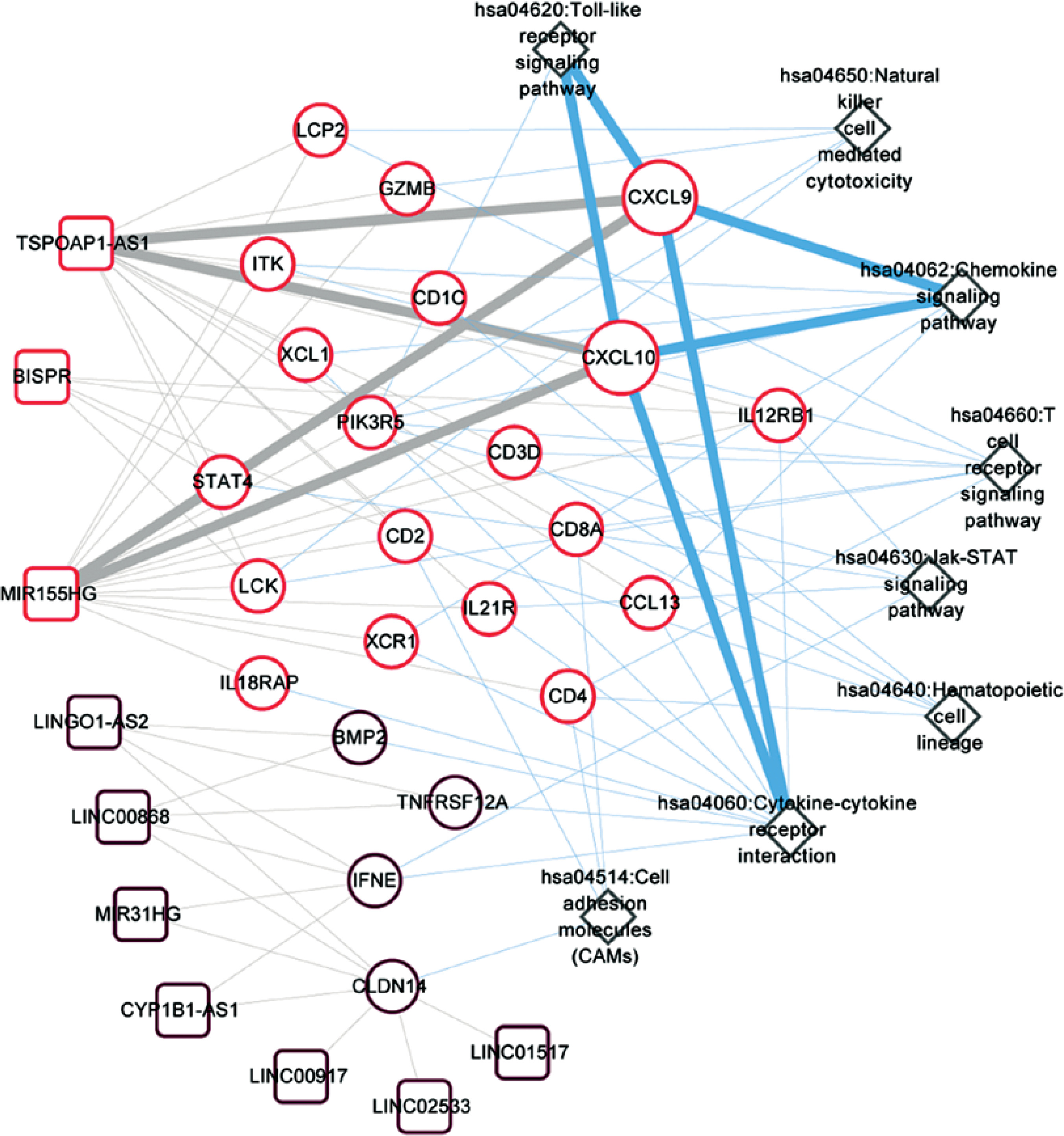 Figure 7 illustrates the involvement of CXCL9 and CXCL10 in three KEGG pathways: the chemokine signaling pathway, cytokine-cytokine receptor interaction, and Toll-like receptor signaling pathway. Furthermore, the expression levels of CXCL9 and CXCL10 showed significant associations with lncRNAs, such as MIR155HG and TSPOAP1-AS1. Additionally, other important immune-related genes, namely CCL13 and IL-21R, were also found to be involved in the pathways associated with CXCL9 and CXCL10.