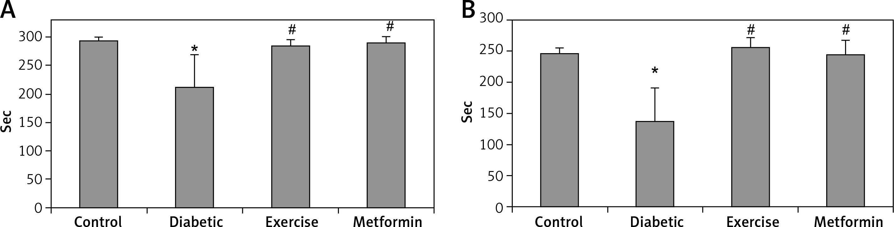 The diabetic group showed significant lower latency in the step-down avoidance test, both 2 and 48 h after exercise (–27.85% and –44.5% respectively), compared to the control group. However, rats put under regular exercise, and the metformin-treated group did not show any significant difference compared to the control group. On the other hand, the results showed significant higher latency in the exercise (+34.65% and +87.5% respectively) and metformin-treated (+36.83% and +78.8% respectively) groups compared to the diabetic group. Last, there was no significant difference between the exercise and metformin-treated groups (Table I, Figure 1).