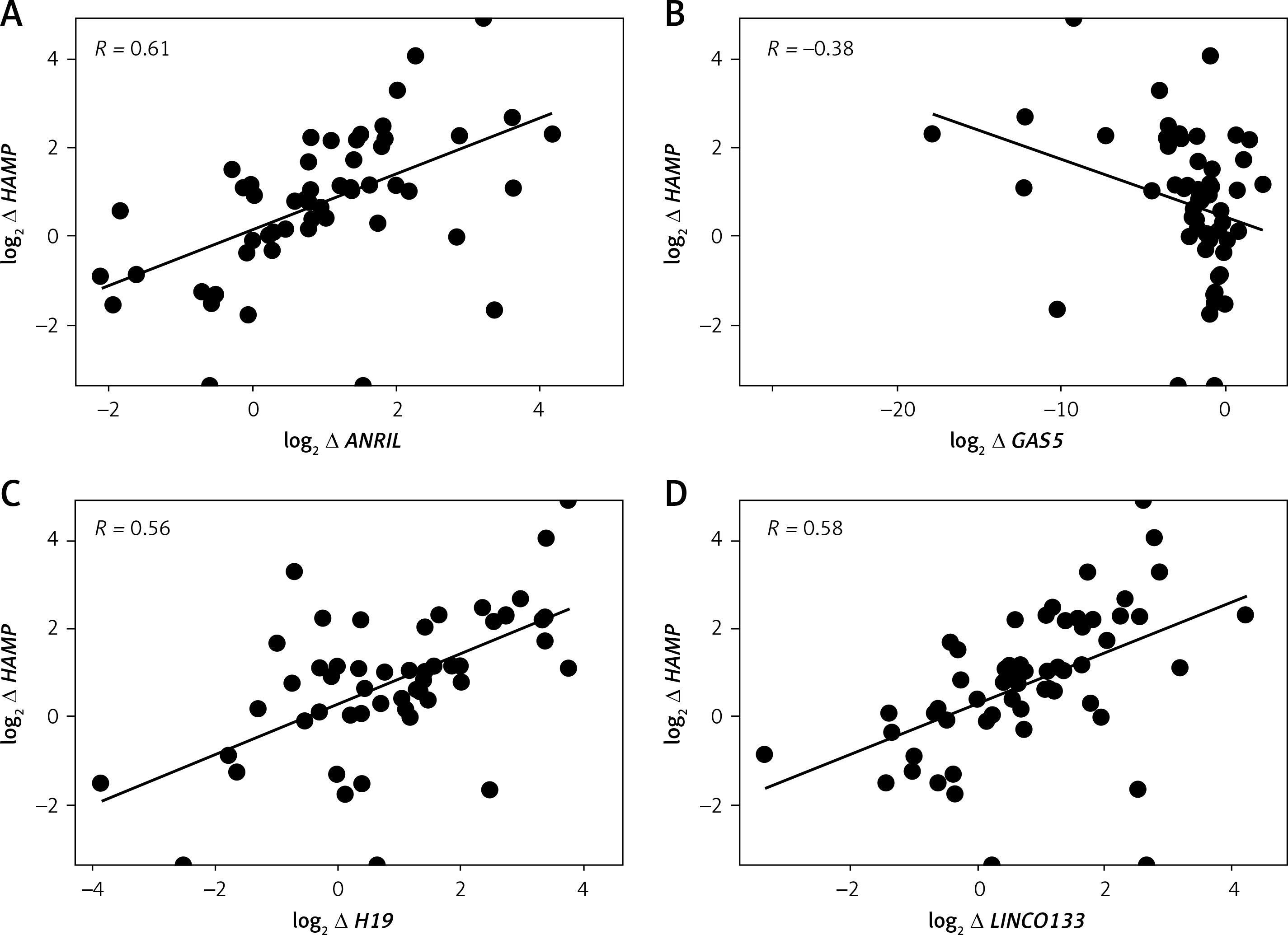 | log2 ∆ LncRNAs | ANRIL | GAS5 | H19 | LINCO133 | MIAT | NEAT1 |