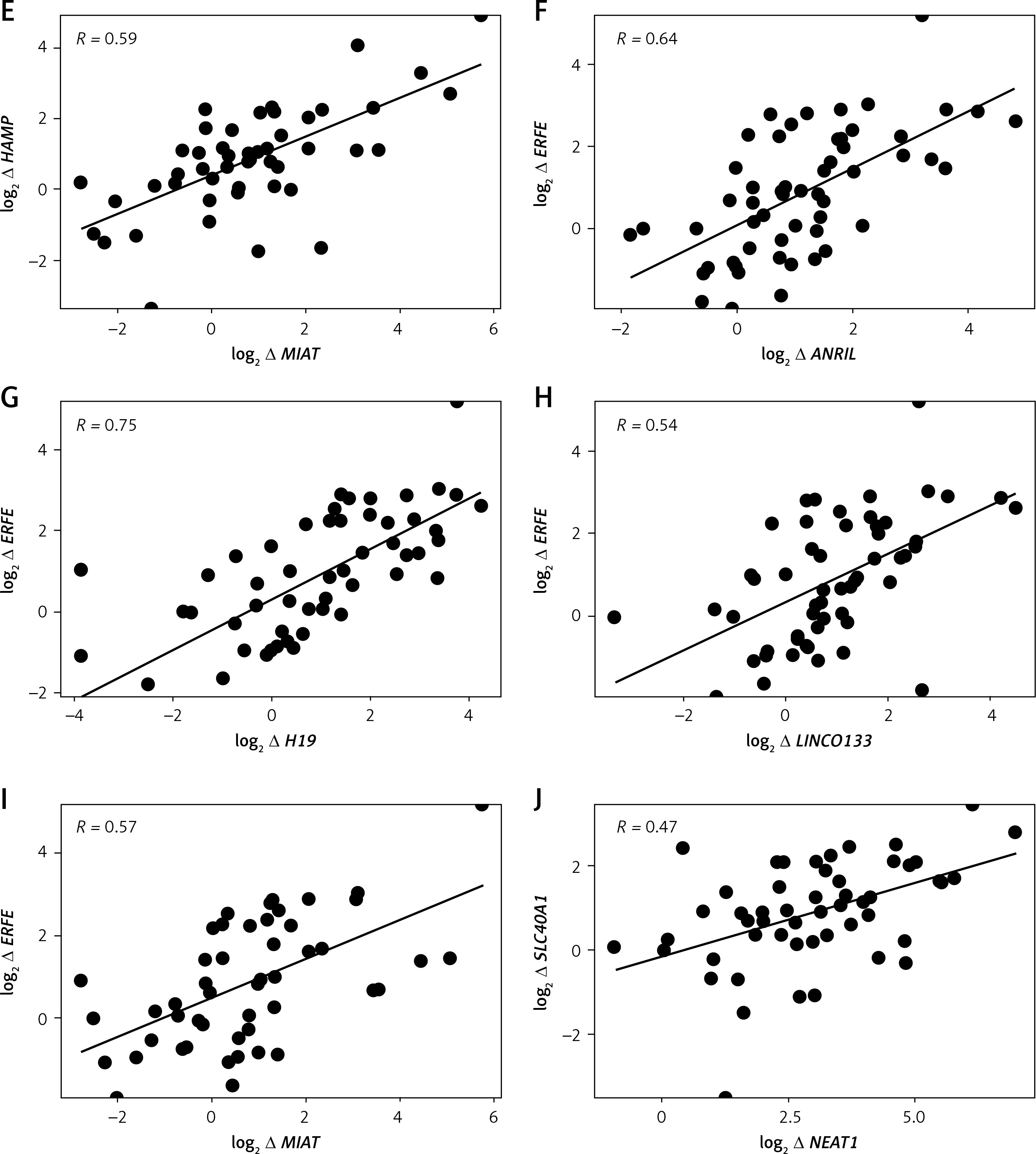 Log2 fold changes in HAMP and FAM132B were strongly and significantly correlated (p < 0.0001) with LncRNA ANRIL, LncRNA H19, LncRNA LINCO133, and LncRNA MIAT (Table V, Figures 2 A, C–I). In contrast, GAS5 expression exhibited a significant negative correlation (p < 0.05) with HAMP expression (Table V, Figure 2 B). Furthermore, log2 fold change in SLC40A1 (encoding ferroportin) positively and markedly (p < 0.001) correlated with log2 fold change in LncRNA NEAT1 (Table V, Figure 2 J). No significant correlations were observed between the differentially expressed LncRNAs and the iron/erythropoiesis regulatory proteins in the control group (data not shown).