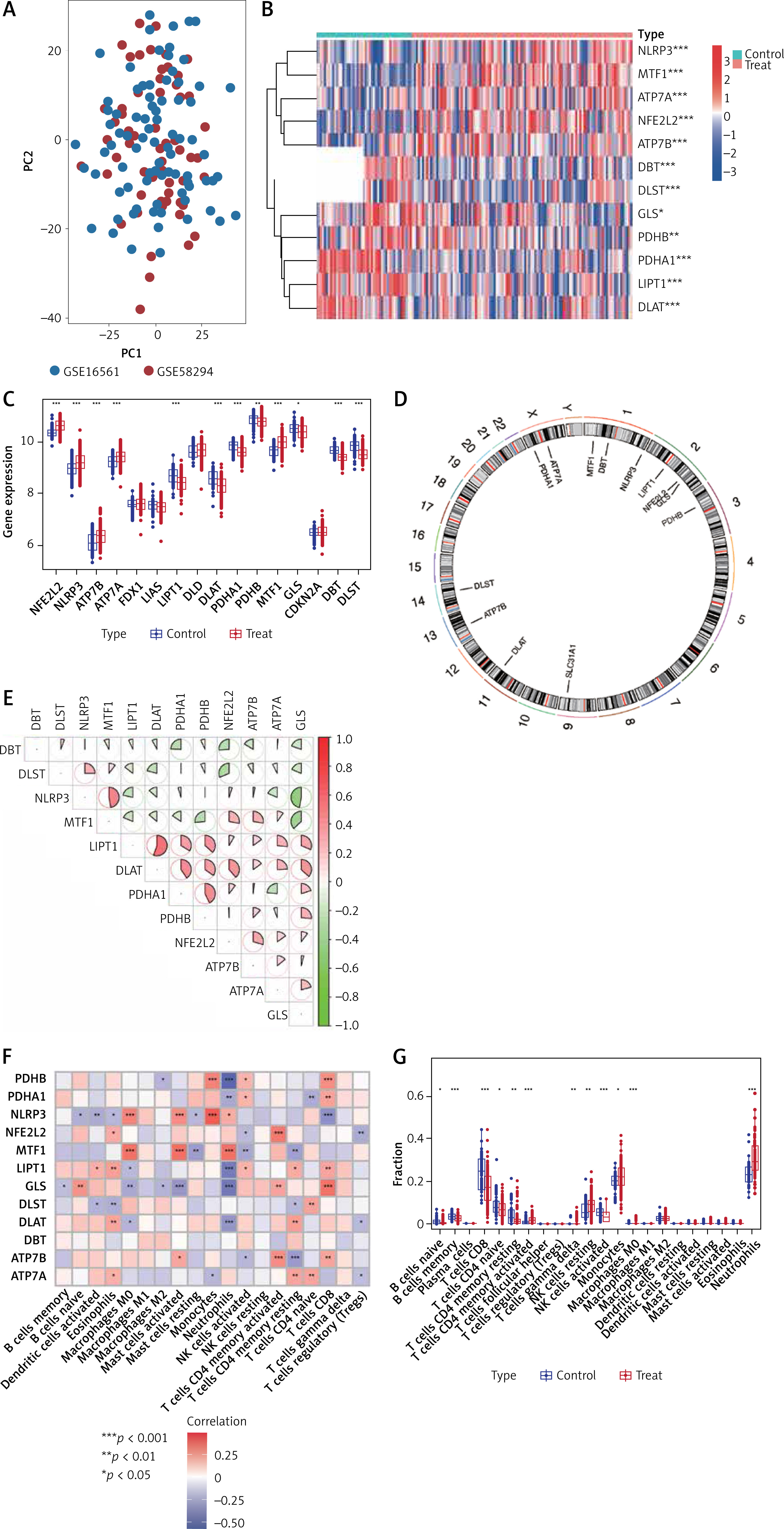 The CuDEGs in IS. A – The PCA analysis shows the distribution of two datasets of IS. B – The heatmap shows the expression of cuproptosis-related genes in the two groups. C – The boxplot shows the comparison of cuproptosis-related genes between the two groups. D – The circos plot shows the chromosome location of Cu-DEGs. E – The correlation heatmap of significant CuDEGs in the IS group. F – The correlation heatmap of significant CuDEGs and infiltrated immune cells in the IS group by CIBERSORT. G – The boxplot shows the comparison of infiltrated immune cells between the two groups