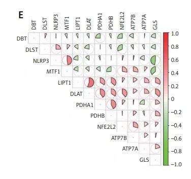 Results. Data Processing and CuDEGs identifying. PCA analysis showed a mixture distribution of samples between two GSE datasets (Figure 1 A). The cuproptosis-related gene list was summarized from the literature review and shown in Supplementary Table SI [8]. With a criterion of adjusted p-value < 0.05, a total of 12 cuproptosis-related genes were considered as CuDEGs, of which five genes were upregulated and seven genes were downregulated. The heatmap and circos plot of CuDEGs and their chromosome location are displayed in Figures 1 B and D. The boxplot further shows the expression comparison of CuDEGs (Figure 1 C), and the top 12 were illustrated by correlational heatmap (Figure 1 E).