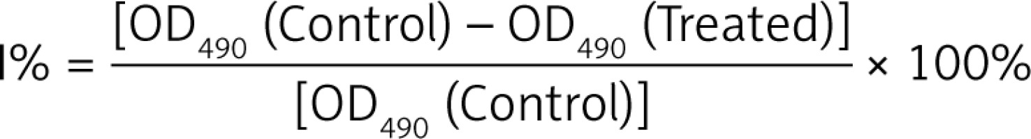 The cytotoxic effects of dehydrocostus lactone on BON-1 cell proliferation were determined by MTT assays. BON-1 cells (2 × 105 cells/well) were seeded and cultured with varying doses of dehydrocostus lactone (0, 5, 25, 75, and 100 μM each) for 24 and 48 h. Following drug treatment, the medium was changed and 3-(4,5-dimethylthiazol-zyl)-2,5-diphenyltetrazolium bromide (MTT: 2 mg/ml) was added for 3 h. The number of viable cells is equal to the formation of formazan crystals which were dissolved in ethanol and the optical density was measured on a microplate reader (ELX 800; Bio-tek Instruments, Inc., Winooski, VT, USA) at a wavelength of 490 nm. The effects of dehydrocostus lactone on cell viability were calculated as an inhibition ratio (I %) using the following equation (optical density at 490 nm):