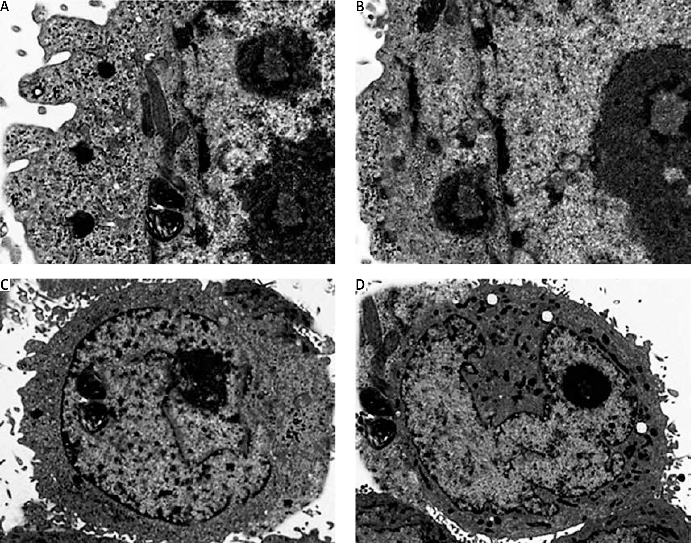 Transmission electron microscopy (TEM) analysis for evaluating the effect of dehydrocostus lactone on the apoptosis induction in BON-1 cells. A – Untreated control group, B–D –cells treated with 5, 50 and 100 μM dose of the compound (cells were observed at 8000× magnification). Appearance of vacuoles at higher doses is a sign of an early apoptotic event. All images are representatives of three biological replicates