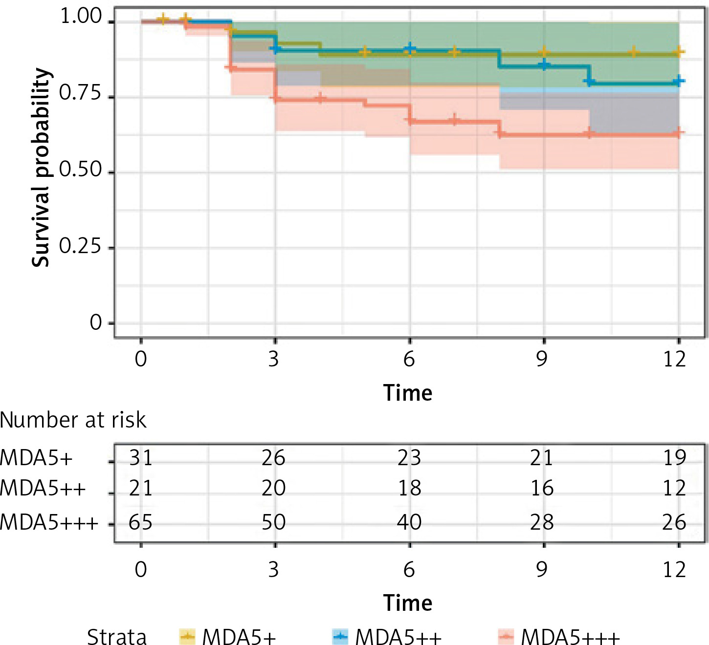Survival analysis of anti-MDA5+ DM patients with ANA negativity. Survival analysis showed a statistically significant difference in the mortality rate between MDA5+++ and MDA5+ patients (log-rank p = 0.025)