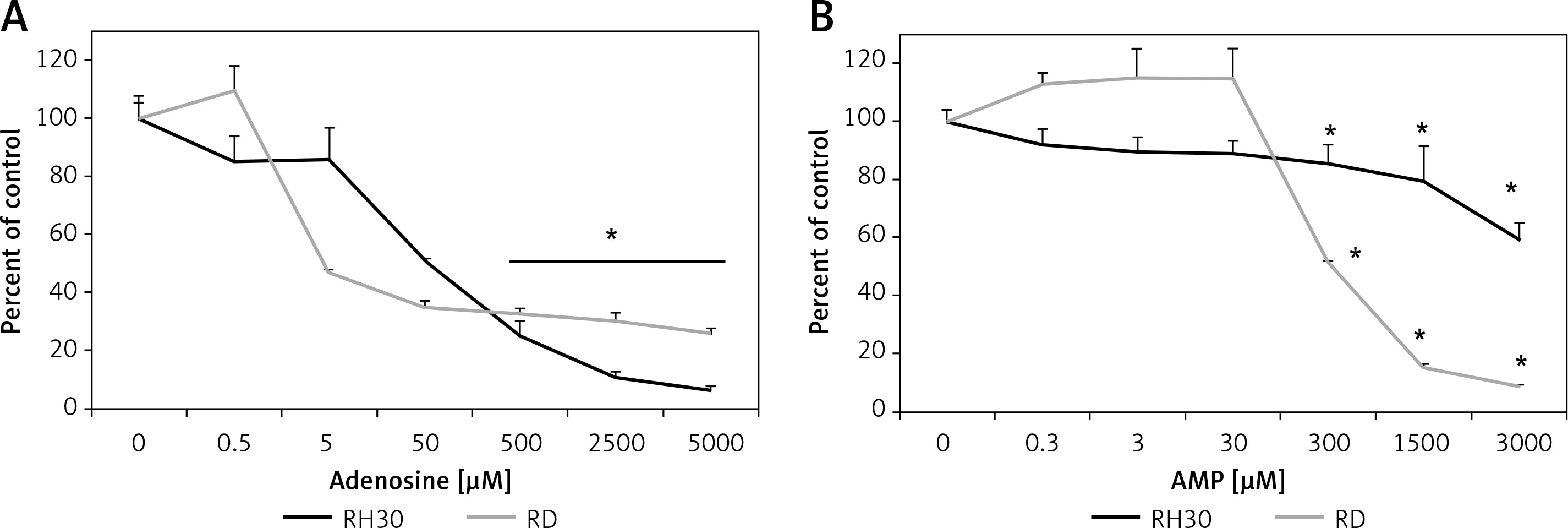 Multiple factors including application of the treatment strategies, hypoxia related to solid tumour environment and even local muscle activity or blood flow may cause adenosine release and elevate its concentration. What is more, purine nucleotides and adenosine may be released and their concentrations highly elevated as a result of radio- or chemotherapy-induced cell damage [19–21]. Based on the above, the present study was undertaken to examine the possible roles of adenosine and adenosine receptor agonists in regulating metastasis and proliferation of rhabdomyosarcoma cancer cells.