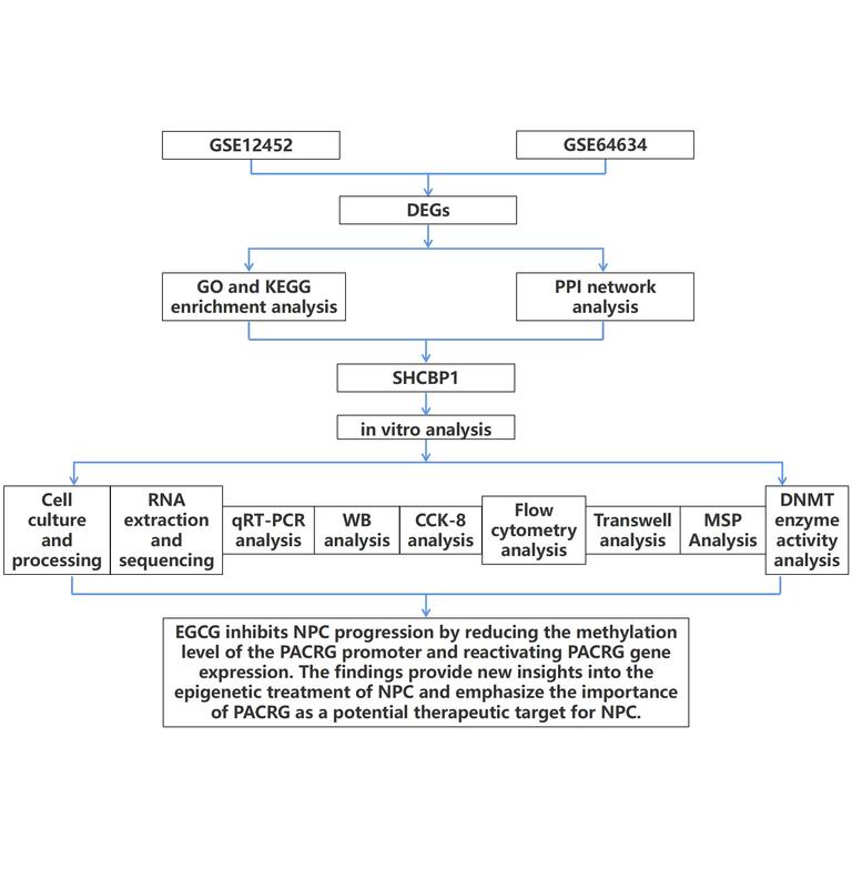 NPC cells were subjected to EGCG or 5-aza-dC. Cellular functions were assessed by CCK-8, Transwell, and flow cytometry assays. Methylation-specific PCR (MSP) was used to identify PACRG promoter methylation, and gene expression was measured using quantitative real-time PCR (qRT-PCR) and Western blot (WB). The expression of DNA methyltransferase-related genes was evaluated. siRNA targeting PACRG was used to assess its functional involvement in the effects mediated by EGCG.