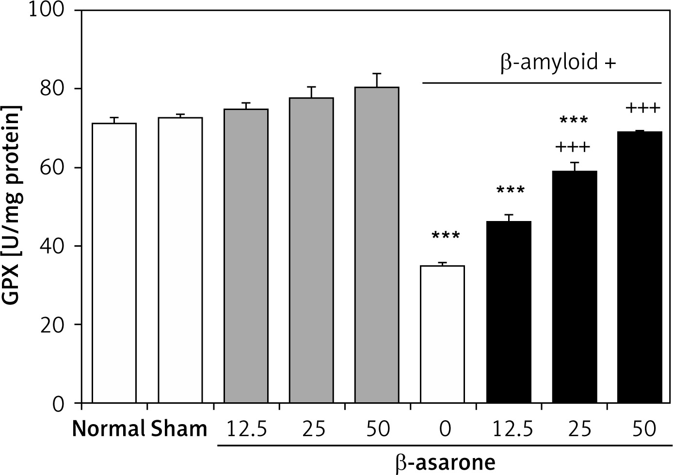 Effect of oral administration of β-asarone at doses of 12.5, 25, and 50 mg/kg body weight on GPX activities in hippocampal homogenates of normal and Alzheimeric rats. Each column represents mean ± SEM for six rats. Normal control rats administered with corn oil as a vehicle. ***P < 0.001 significantly different from the normal control group. +++P < 0.001 significantly different from the Alzheimeric control group
