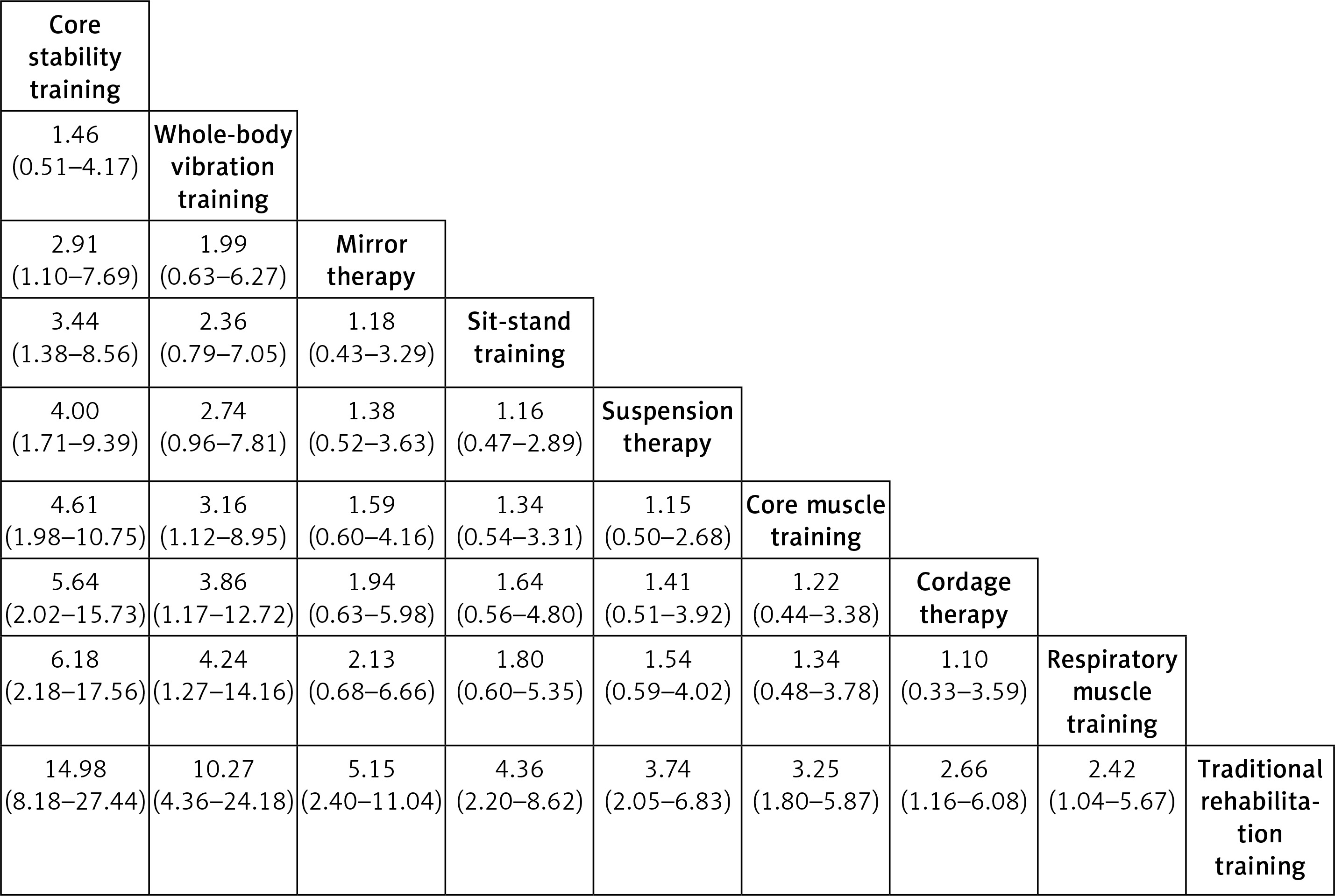 Two-by-two comparison matrix of different rehabilitation training measures (shown as odds ratio and 95% confidence intervals)