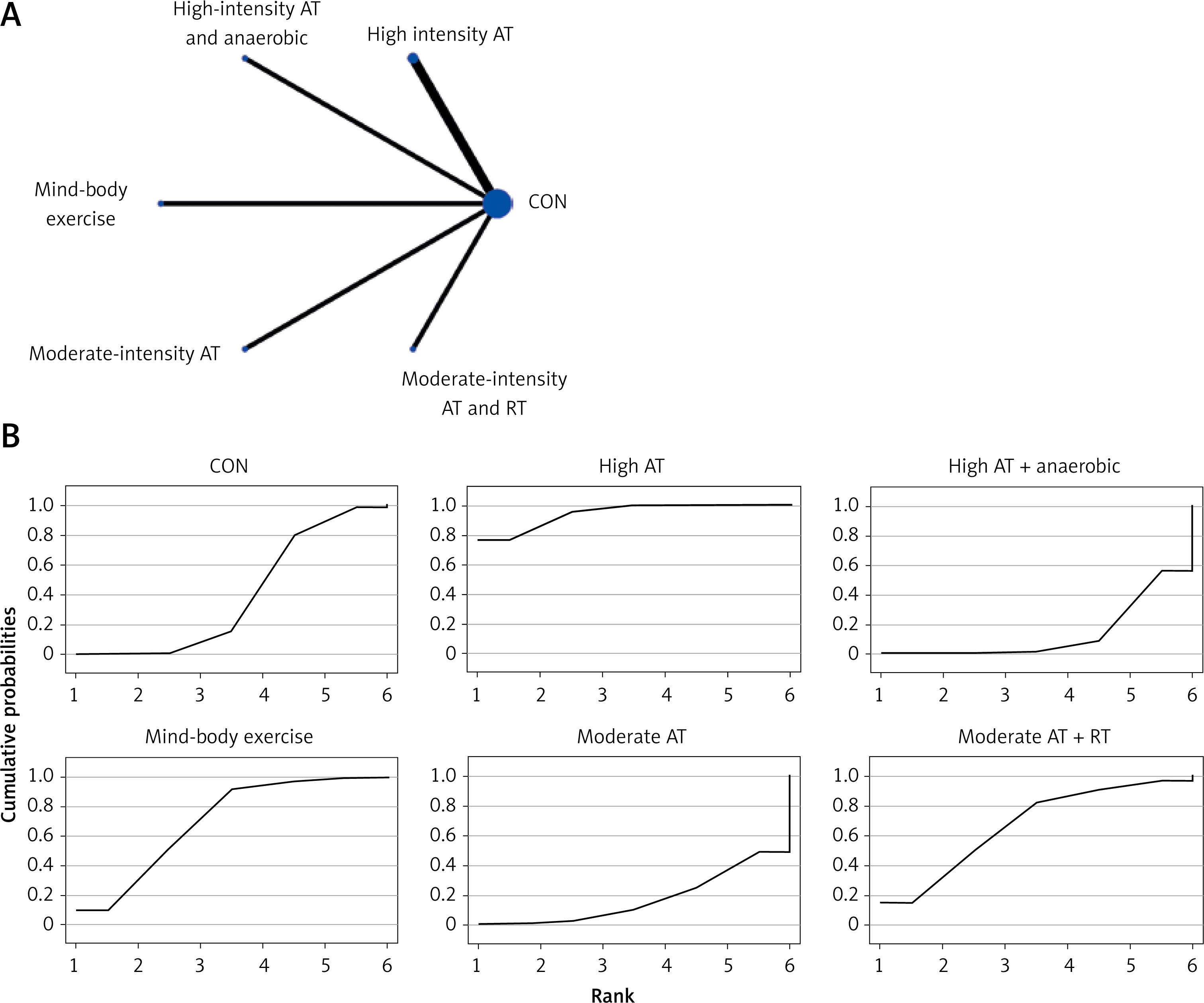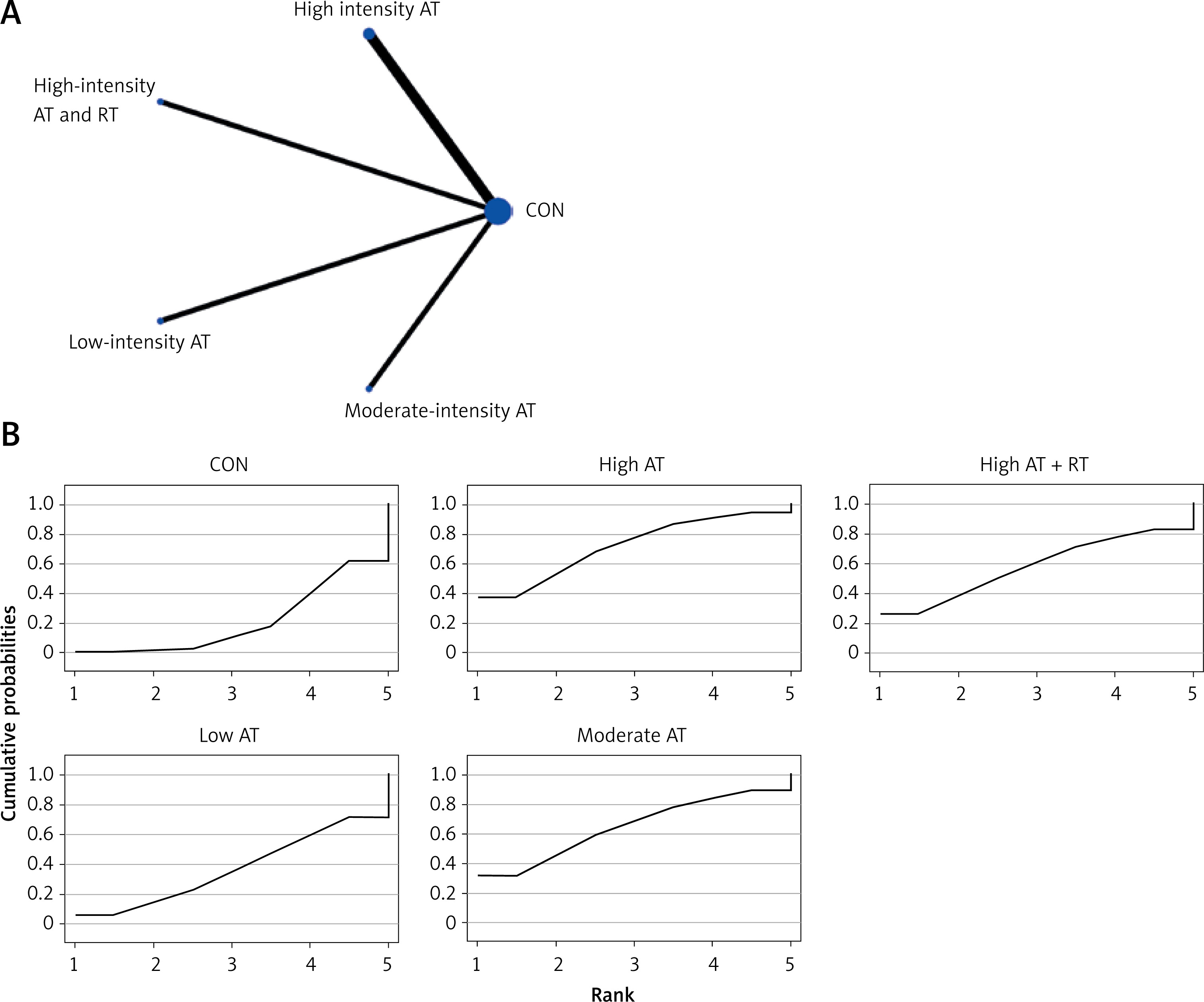 All indirect and direct comparisons between studies were tested for consistency and inconsistency, with p-values greater than 0.05 indicating that the consistency effect across studies is acceptable. Detailed information is provided in Supplementary Table SV. The NMA results revealed that, compared to the control group’s daily activity, high-intensity aerobic training combined with anaerobic training (MD = –1.92, 95% CI = (–2.36, –1.48)) and high-intensity aerobic training (MD = –0.94, 95% CI = (–1.67, –0.21)) were superior in reducing TC (details are shown in Table II D). SUCRA probability rankings for different intensities of exercise interventions showed that high-intensity aerobic training combined with anaerobic training (SUCRA: 98.9%, as shown in Figure 5 B) ranked first in reducing TC.