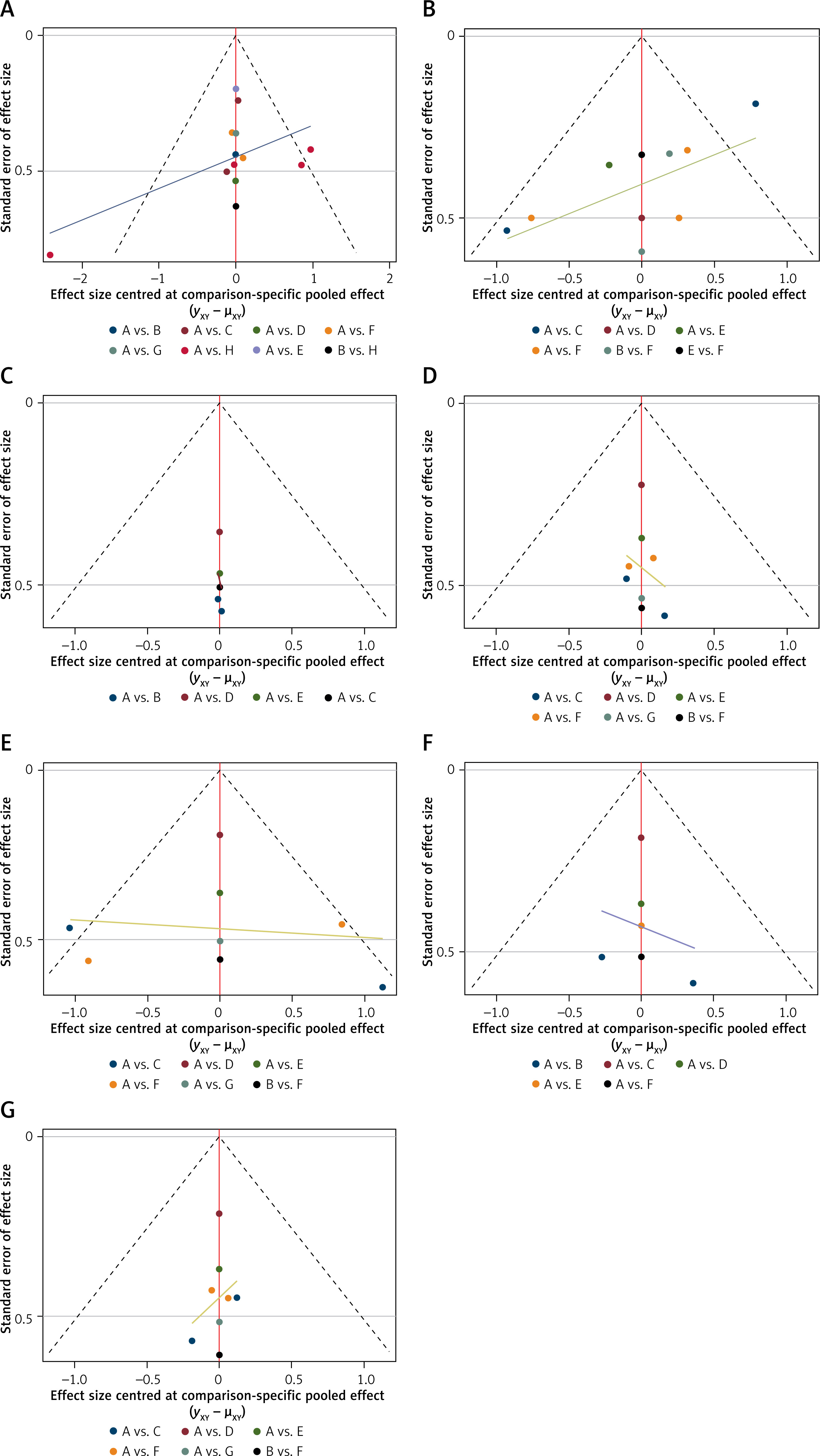 The network evidence plots for each outcome measure are shown in Figures 2 A, 3 A, 4 A, 5 A, 6 A, 7 A, and 8 A.