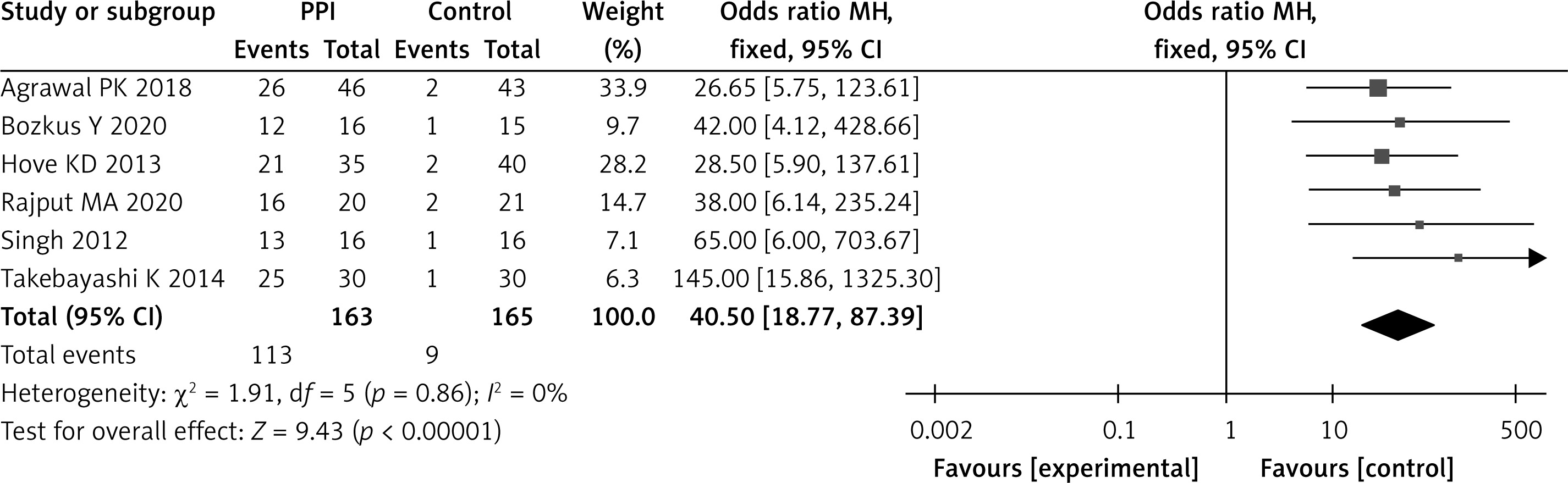 Six studies analyzed the endoscopic response rate after 8 weeks of treatment. Heterogeneity test results showed that the studies were not statistically heterogeneous (p = 0.86, I2 = 0%). The meta-analysis study showed that in the PPI group, the endoscopic effective rate was 69.32% (113 cases/163 cases), while in the control group, it was 5.45% (9 cases /163 cases), OR = 40.50 (95% CI: 18.77–87.39, p < 0.001), and the two groups differed significantly (Figure 4).