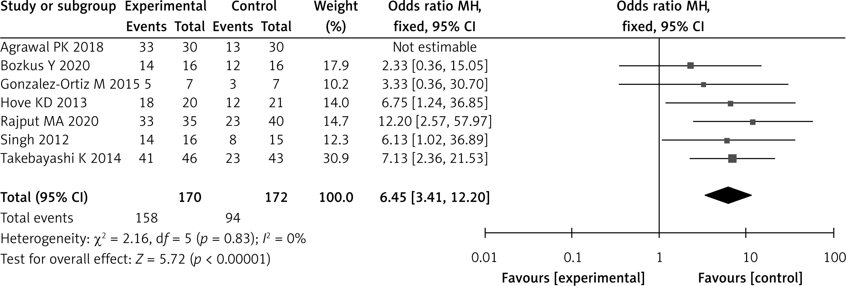 Symptom remission rates were analyzed in seven studies. According to the heterogeneity test results, no statistical heterogeneity existed among the studies (p = 0.83, I2 = 0%). The meta-analysis showed that the symptom relief rate of patients in the PPI group was 92.94% (158 cases /170 cases), and in the control group it was 54.65% (94 cases/172 cases). OR = 6.45 (95% CI: 3.41–12.20, p < 0.001), and both groups differed significantly (Figure 5).