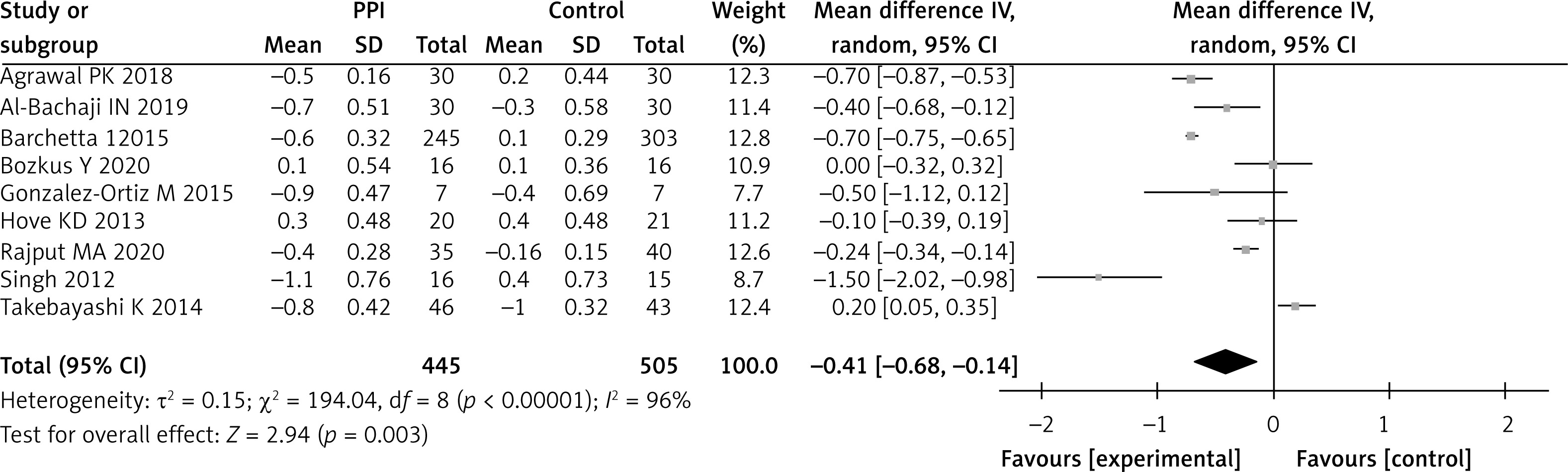 Changes in HbA1c levels were observed in all nine studies. Both groups showed high heterogeneity (p < 0.001, I2 = 96%). Overall, the PPI group showed an additional 0.41% reduction in HbA1c compared with the control group (WMD = –0.41; 95% CI: –0.68 to –0.14, p = 0.003) (Figure 6). The difference between the two groups was statistically significant.