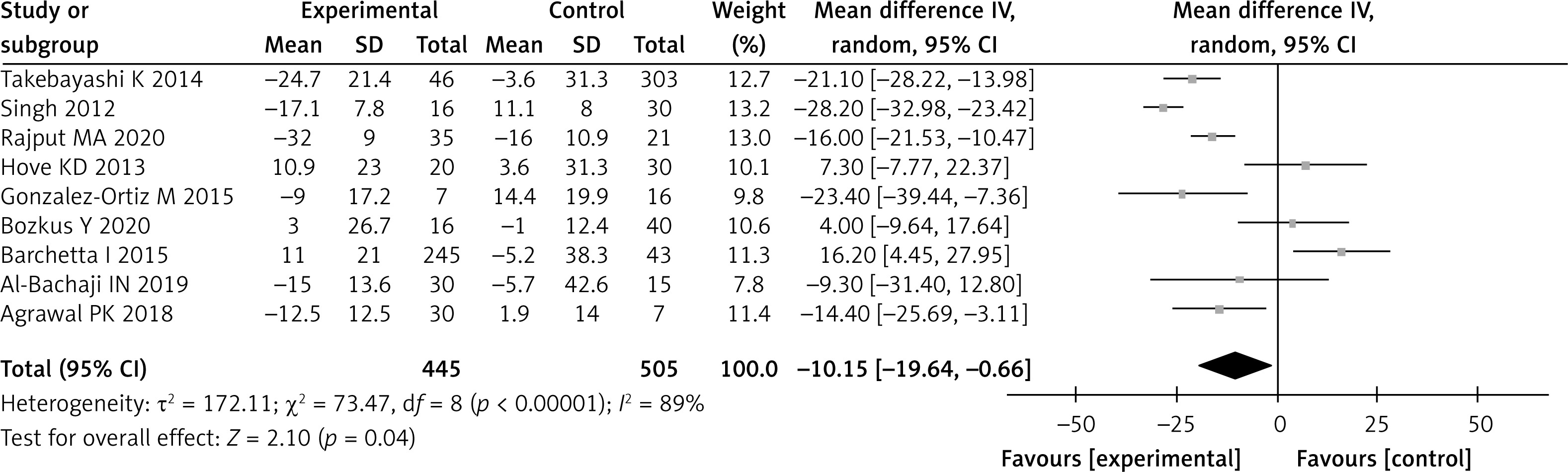 Changes in FBG levels were analyzed in all nine studies. Both groups showed high heterogeneity (p < 0.001; I2 = 89%). Overall, the PPI group showed an additional 10.15 mg/dl reduction in FBG compared with the control group (WMD = –10.15 mg/dl; 95% CI: -19.64–-0.66; p = 0.04), and the two groups differed significantly (Figure 7).
