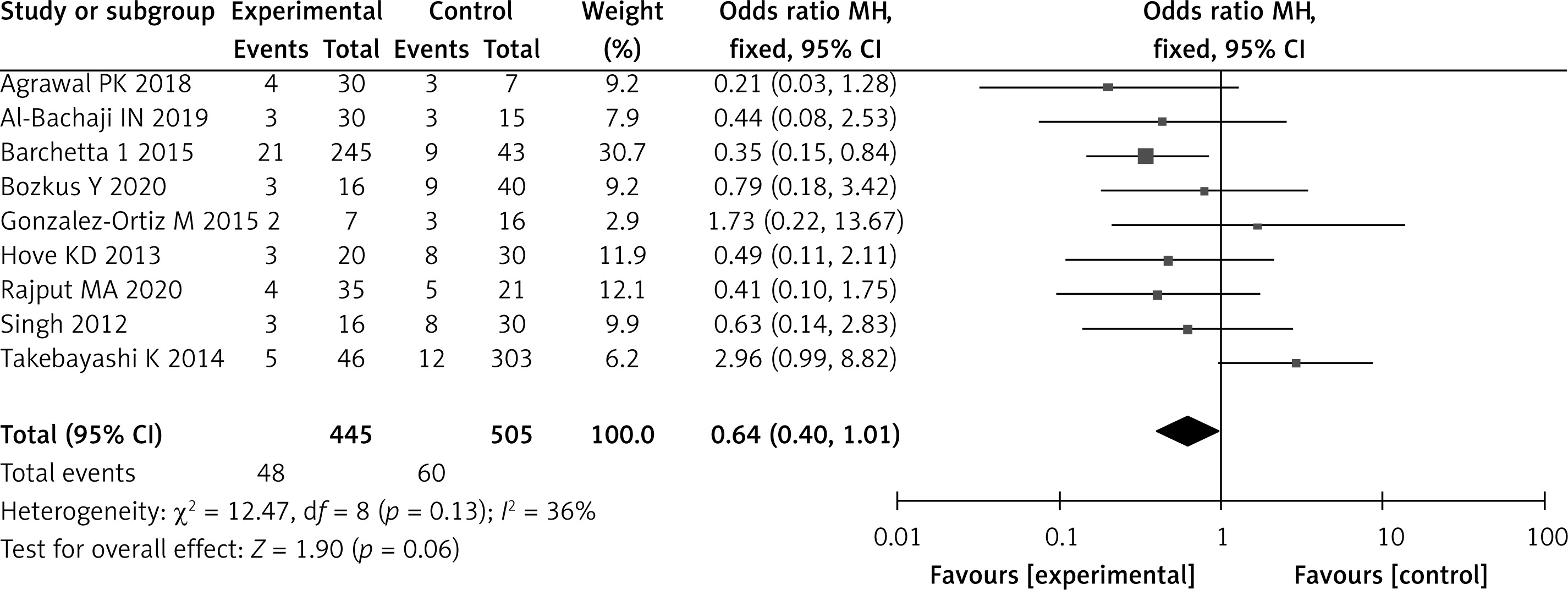 The incidence of adverse reactions was analyzed in nine studies. According to the heterogeneity test results, no statistical heterogeneity existed among the studies (I2 = 36%, p = 0.13). The meta-analysis showed that the incidence of adverse reactions in patients in the PPI group was 10.78% (48 cases/445 cases) and that in the control group was 11.88% (60 cases/505 cases). According to Figure 8, there was no statistical significance; OR = 0.64, 95% CI (0.40, 1.01), p = 0.06 (Figure 9).