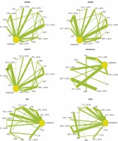 The characteristics of included trials are shown in Table I. In detail, 33 of 56 different trials covered patients around the world and 15 trials included patients predominantly from Asia. The rest of the trials were reported to include patients from Europe (5 studies) and America (3 studies). The length of follow-up ranged from 12 to 54 weeks. Most of the trials included a comparison between two interventions. Only 5 trials mentioned comparisons among three interventions. All trials involved 10 drugs as follows: infliximab (INF), etanercept (ETN), adalimumab (ADA), golimumab (GOL), tocilizumab (TCZ), abatacept (ABT), certolizumab pegol (CZP), methotrexate (MTX), conventional disease-modifying anti-rheumatic drugs (cDMARDs) and placebo (PBO). The full network of comparisons categorized in different outcomes was shown in Figure 2.