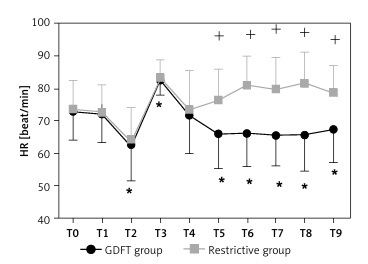 The occurrence of postoperative hypotension (0 vs. 11.67%, p = 0.027) and complications (35.3% vs. 54.9%, p = 0.047) in the GDFT group was lower than in the restrictive group. The volume of saline infused during the operation was 364 (219–408) ml and 50 (50–50) ml, respectively (p = 0.001). Ephedrine was given to 16/51 (29.4%) patients of the GDFT group and 27/51 (52.9%) patients of the restrictive group (p = 0.027).