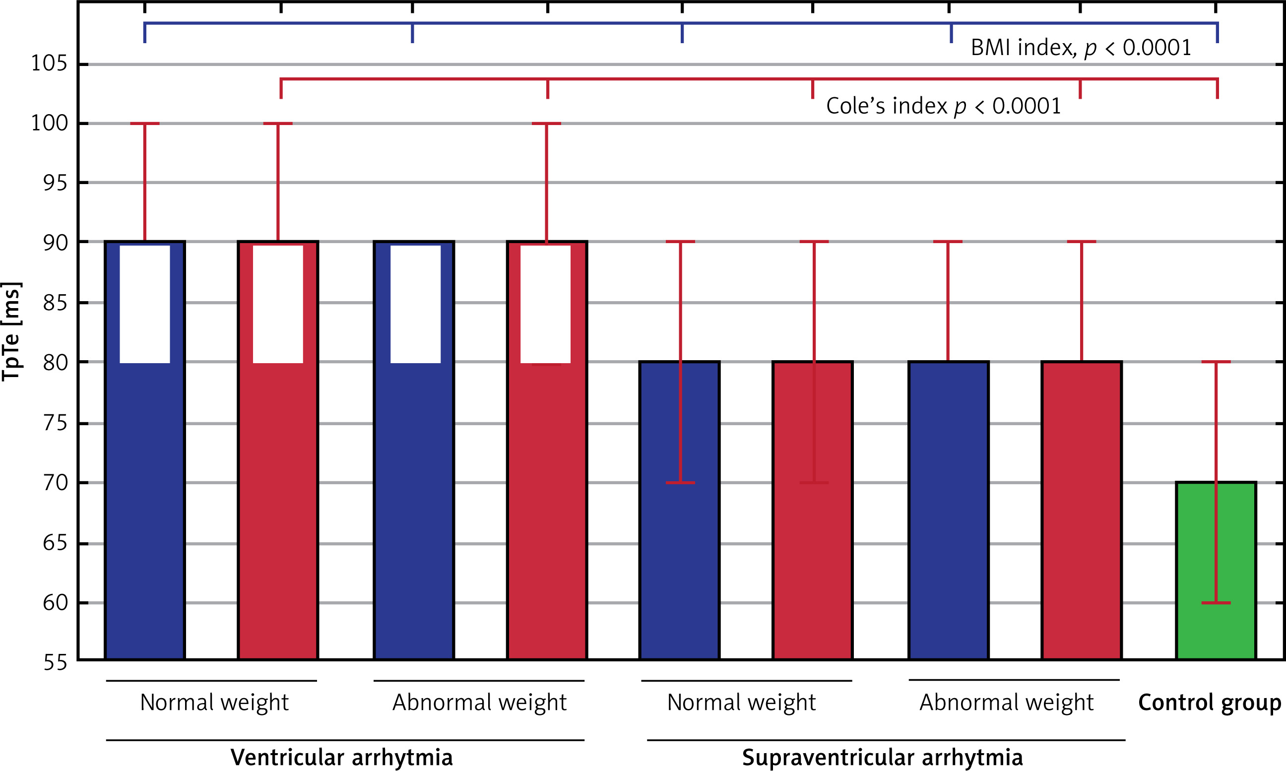 There were no significant differences (TpTe interval: using BMI and Cole’s index) in the group of children with ventricular arrhythmias with abnormal body weight and children with the same arrhythmias with normal weight, as well as in the group with supraventricular arrhythmias in terms of weight in the TpTe interval (using BMI and Cole’s index) and the QT, QTp, QTcB and QTcF intervals with their corrected values. Moreover, there were statistically significant differences in the TpTe interval between the 5 groups: children with ventricular and supraventricular arrhythmia with abnormal and normal weight, as well as the control group depending on BMI and Cole’s index (Figure 1).