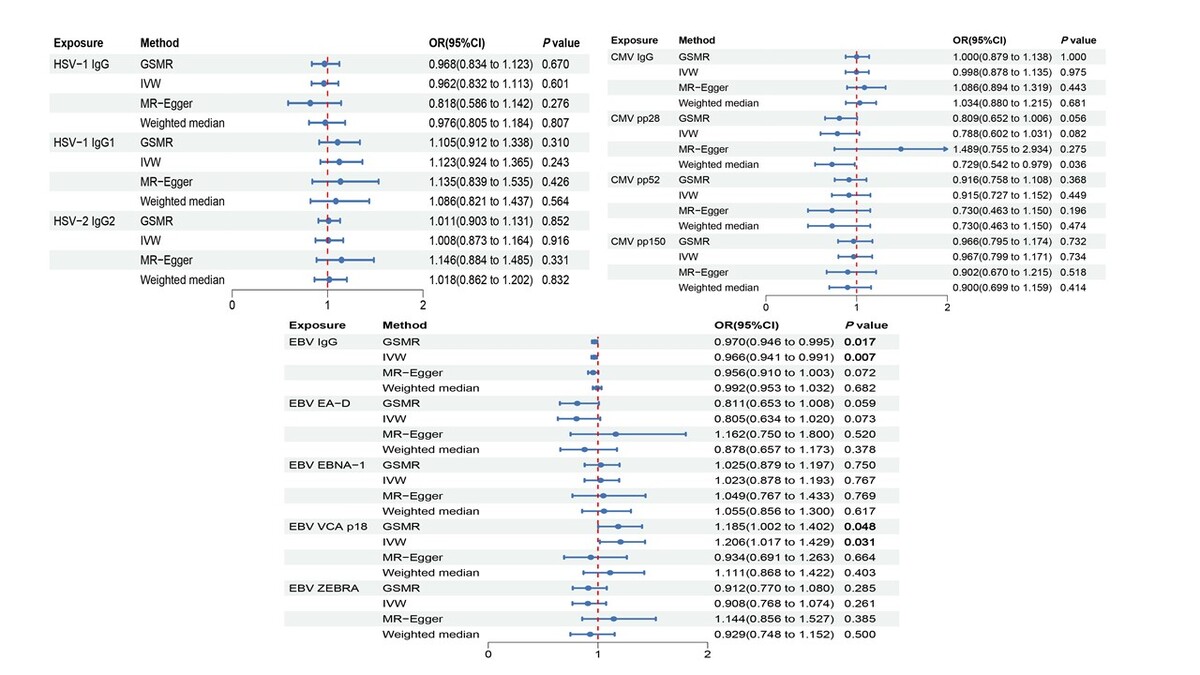 The data for different antibodies against herpes simplex virus (HSV), cytomegalovirus (CMV), and Epstein-Barr virus (EBV) were obtained from the IEU GWAS database (https://gwas.mrcieu.ac.uk/datasets/), and the data for IPF were obtained from the Finngen GWAS database (https://r7.finngen.fi/). We selected eligible single nucleotide polymorphisms (SNPs) from summary-level data of GWAS as instrumental variables. The Generalized Summary data-based MR (GSMR) method was used as the main analysis method, complemented by inverse-variance weighted (IVW), MR-Egger, and weighted median analyses. Sensitivity analyses were conducted to check the robustness of the MR results, and reverse MR analyses were performed to assess the presence of reverse causality.