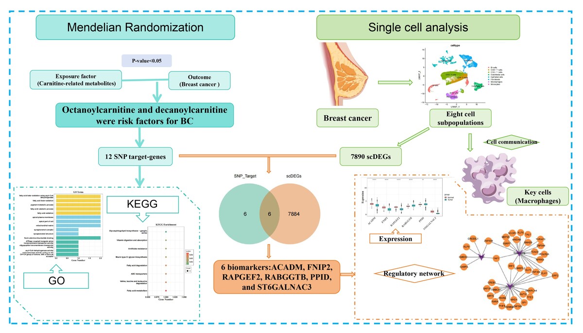 The MR analysis revealed a significant causal relationship between elevated levels of octanoylcarnitine and decanoylcarnitine and an increased risk of BC. Functional enrichment analysis identified 12 candidate genes associated with these metabolites, which are involved in fatty acid β-oxidation (FAO) pathways. ScRNA-seq analysis revealed eight distinct cell subpopulations, with macrophages exhibiting the highest intercellular communication. Six biomarkers were identified as potential contributors to BC development: ACADM, FNIP2, RAPGEF2, RABGGTB, PPID, and ST6GALNAC3.