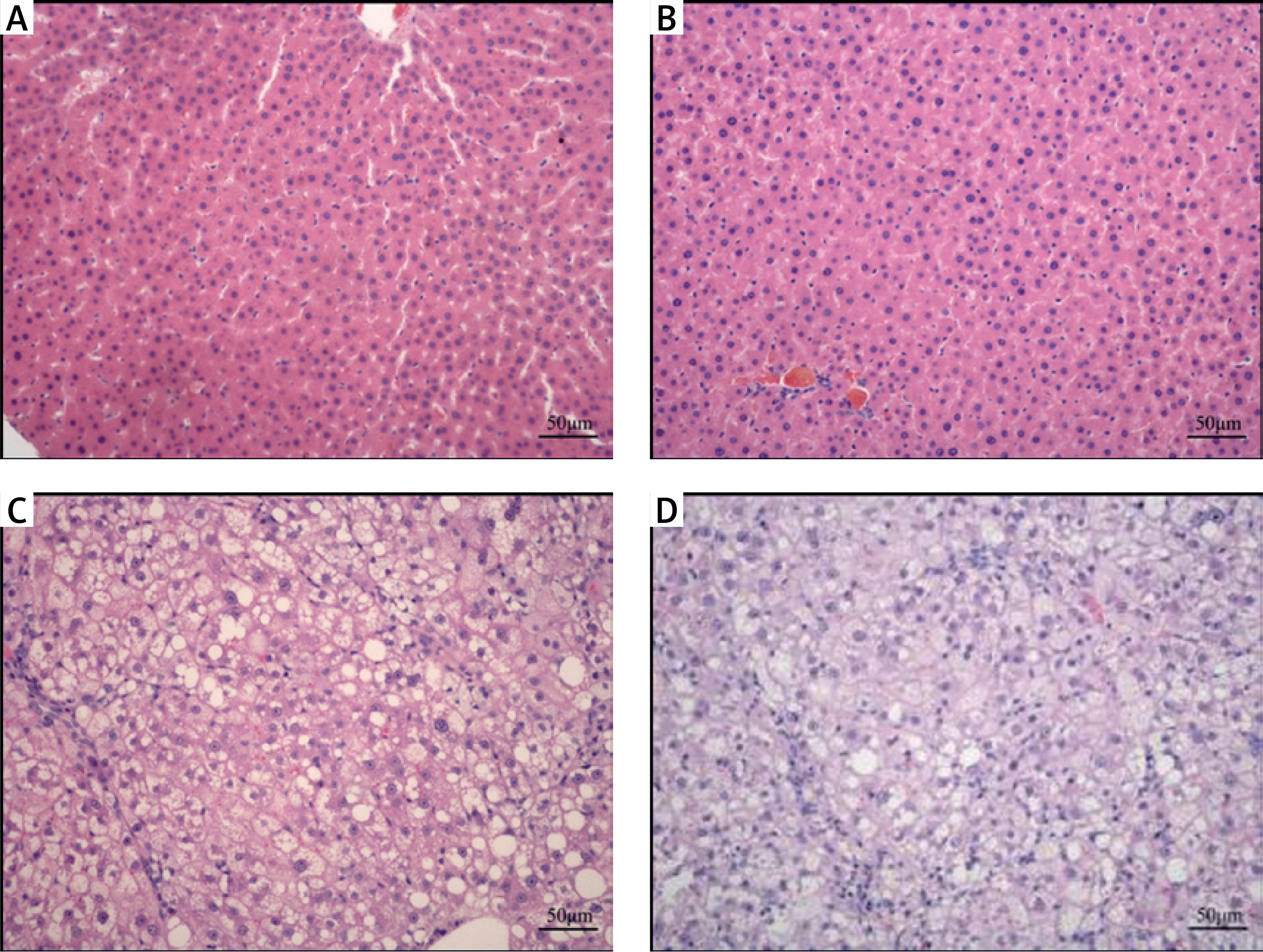Pathology of liver in each group (HE staining × 20). The histopathological modification in each treatment in NB group. The hepatic structure was neatly arranged, and the hematopoietic cells of extramedullary hematopoietic foci were observed in the hepatic sinusoid, in which a large number of mononuclear cells and red cells were found (A). In the control, no obvious fat deposition in the abdominal wall of the gerbils was observed; the liver was not obviously changed; it appeared red with sharp edges, clear lobules and plate-like arranged hepatic cords (B). In the NAFLD and aged groups, the liver appeared yellow with blunt edges and a greasy feeling; some of the gerbils had a swollen spleen, in which the HE staining showed obvious hepatic steatosis (C, D)