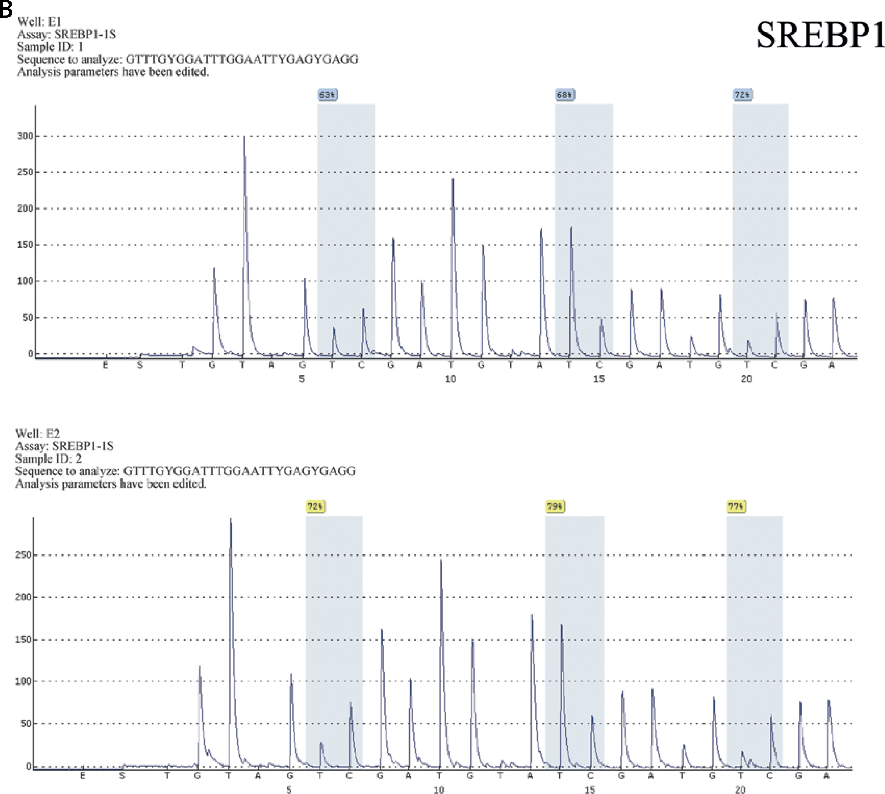 Detection results of CpG island in the promoter region of FASN (A) and SREBP1 (B). The CpG sites were measured using pyrosequencing, and the “methylation%” was the average of “%” of each CpG site measured. The Figure presents the results of the methylation rate of samples A4, A5, E1, E2
