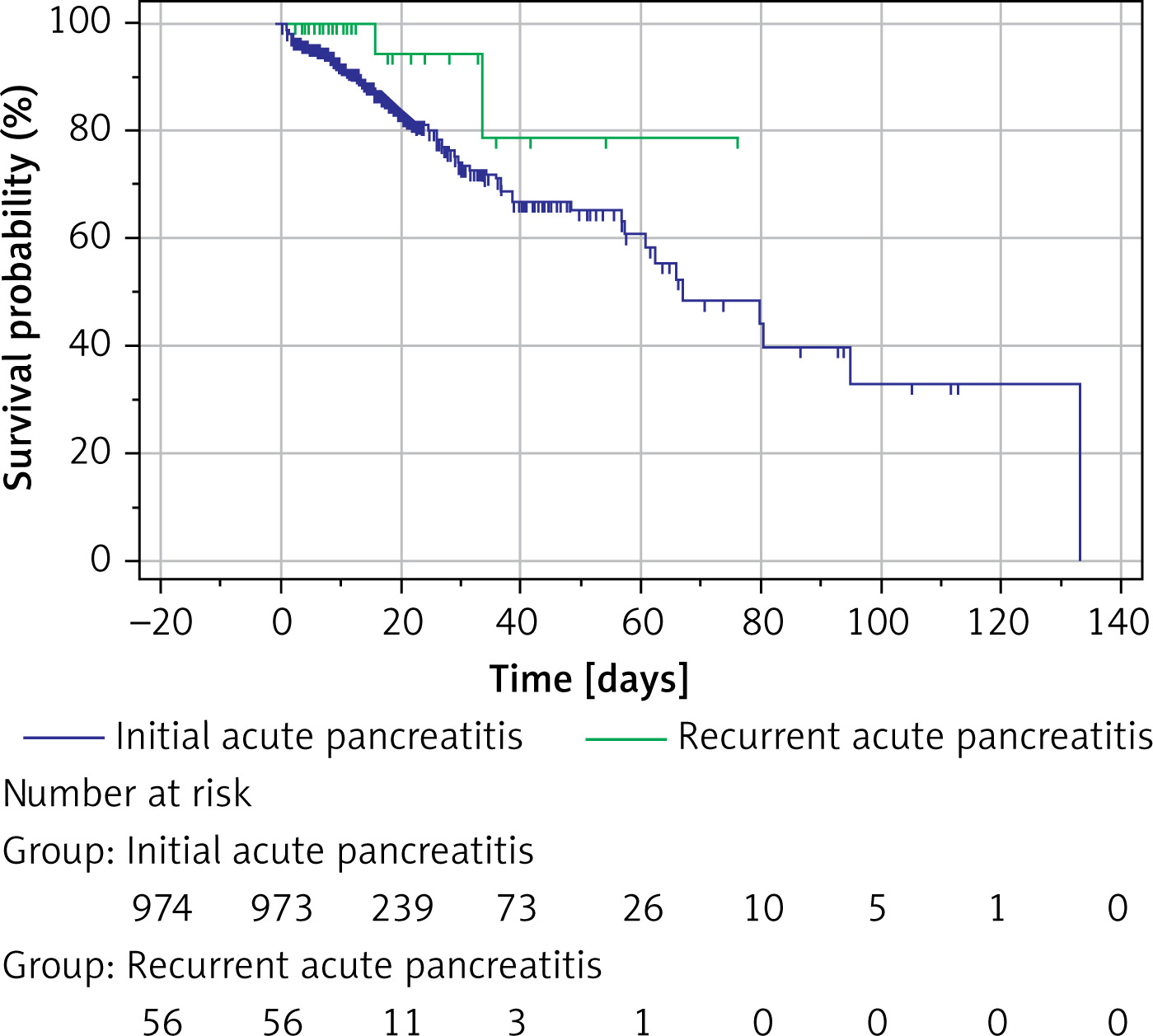 Kaplan-Meier curves of patients with initial and recurrent acute pancreatitis in the intensive care unit