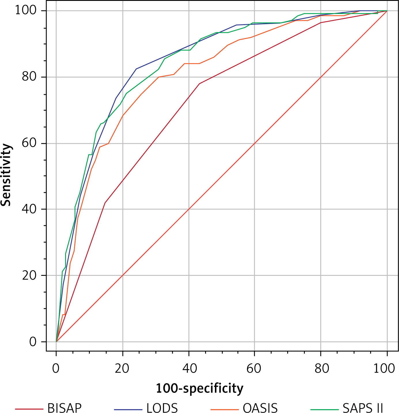 ROC curves of four scoring systems for predicting in-hospital mortality in initial acute pancreatitis
