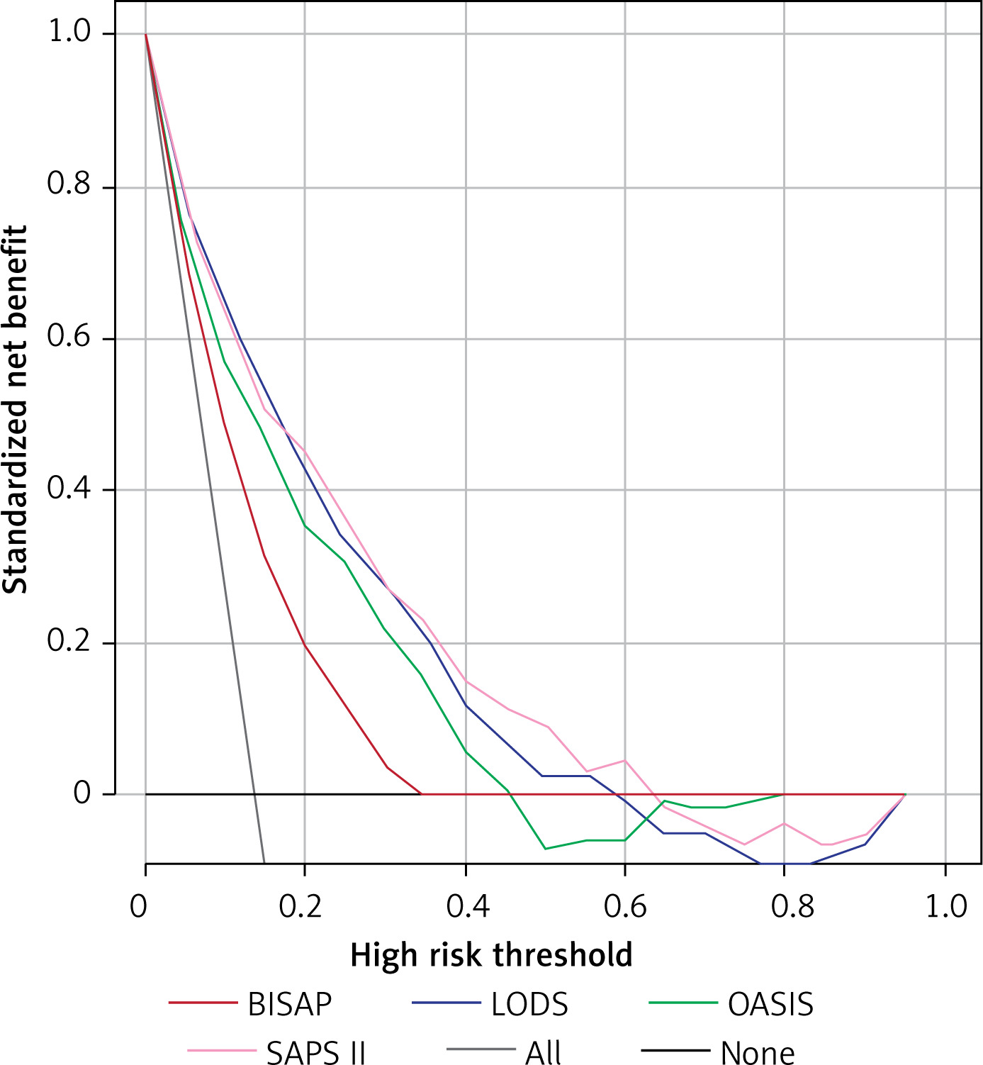 For patients with IAP, the ROC results of the four scoring systems are shown in Figure 2. The AUC values, optimal cutoff values, sensitivity, specificity, and Youden index of the four scoring systems are presented in Table VII, with the following Z-test results: BISAP vs. LODS with a Z value of 5.950, p < 0.0001; BISAP vs. OASIS with a Z-value of 3.785, p = 0.0002; BISAP vs. SAPS II with a Z-value of 5.838, p < 0.0001; LODS vs. OASIS with a Z-value of 2.647, p = 0.0081; LODS vs. SAPS II with a Z-value of 0.183, p = 0.8545; OASIS vs. SAPS II with a Z-value of 2.710, p = 0.0067. In the DCA curves (Figure 3), the net clinical benefit of SAPS II was almost always higher than that of the other scoring systems in the threshold range of 0.2–0.6. However, none of the four scoring systems showed a net clinical benefit above the threshold of 0.6.