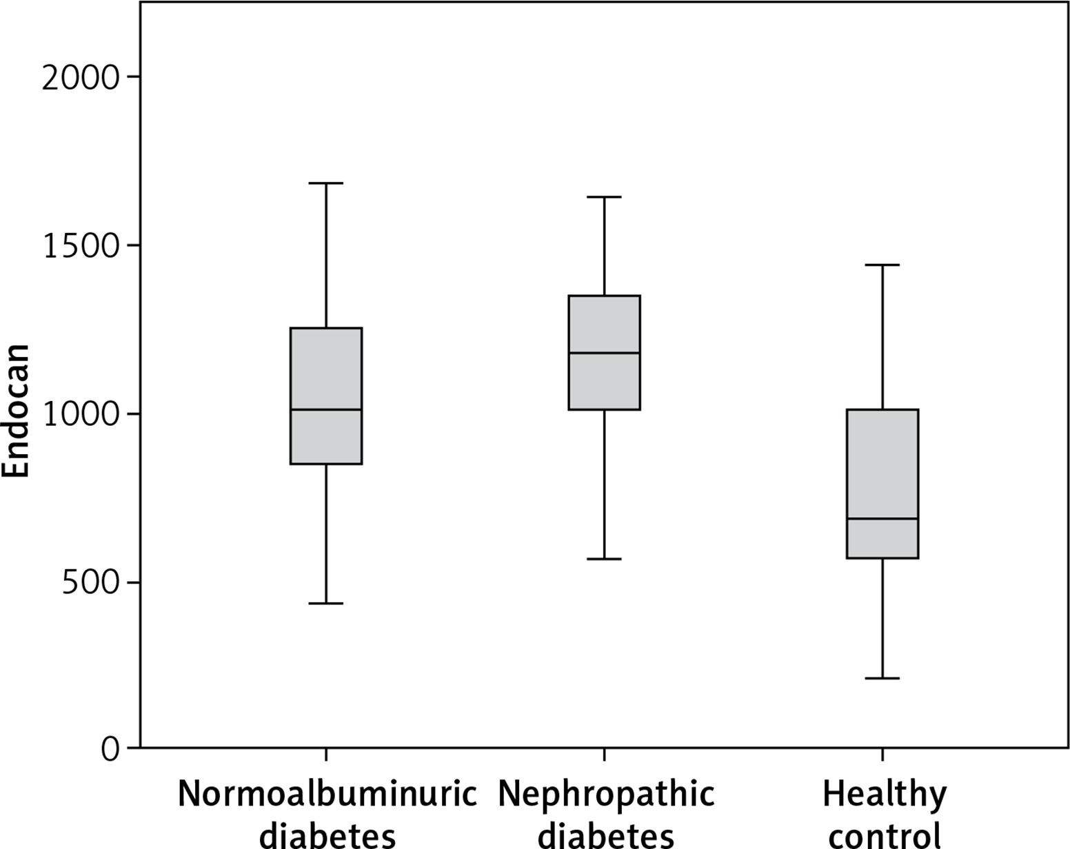Endocan levels of 251 CKD patients and 60 non-diabetic non-CKD controls were evaluated in a study of Yilmaz et al. and endocan levels of CKD patients were higher than those of the control group [23]. The CKD group included 58 diabetes patients and in the analysis, higher endocan levels were recorded in diabetes patients than non-diabetic CKD patients and the control group. In our study also, we found a statistically significant difference in terms of endocan levels between diabetes patients and the healthy control group like this study. But in the study of Yilmaz et al., the control group was constituted from non-diabetics, people and so did not include any diabetes patients without CKD. For this reason no information regarding the difference between nephropathic and non-nephropathic diabetes was obtained.