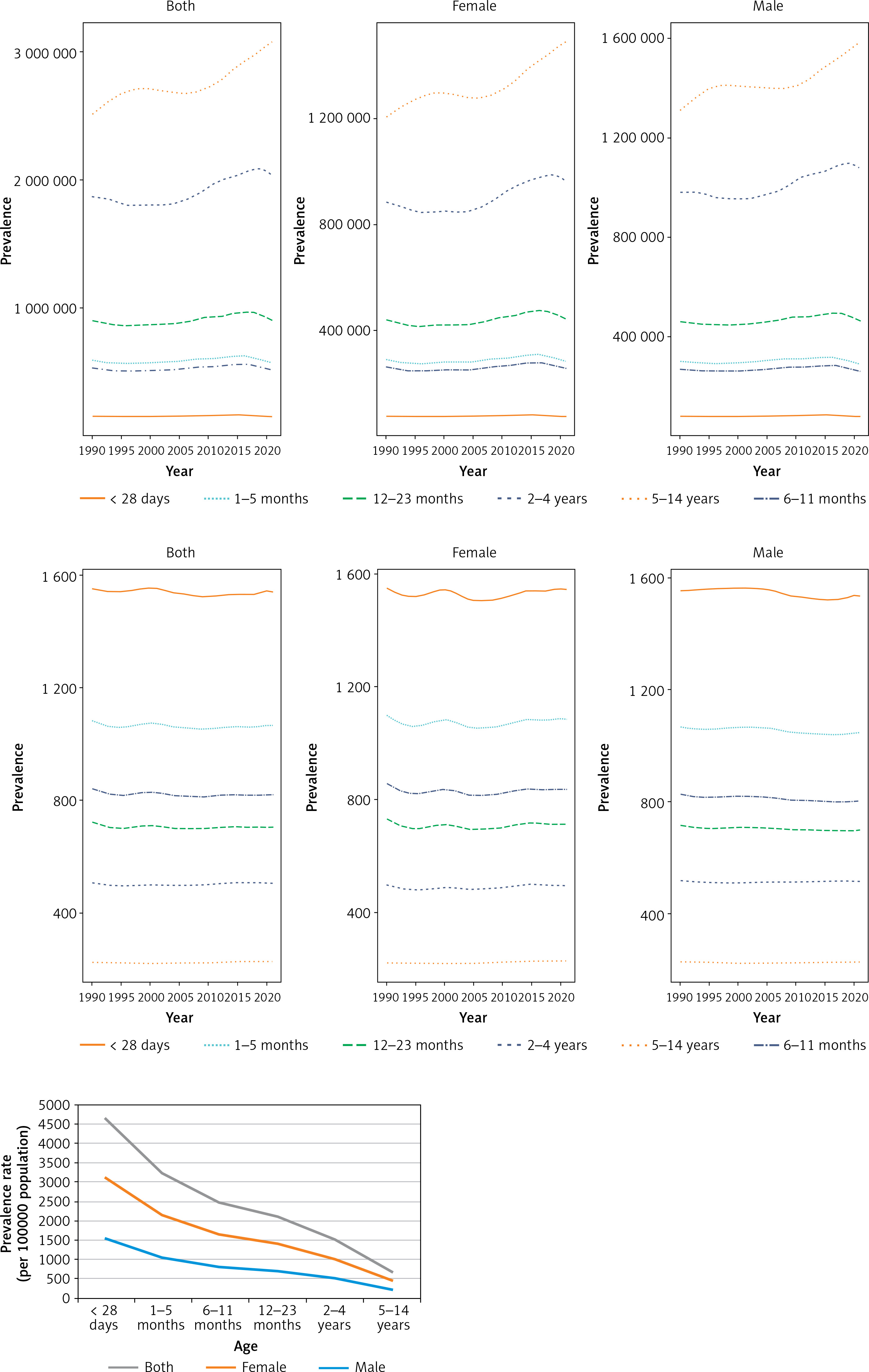 A total of 218,909,652 children – 113,892,505 (52.03%) males; 105,017,147 (47.97%) females – were included in the analysis. From 1990 to 2021, the global prevalence of CHAs decreased by 4.294% (95% UI: –5.696–2.695%). The corresponding prevalence rate decreased accordingly from 377.257 cases per 100,000 people (95% UI: 333.461–424.687) in 1990 to 361.060 cases per 100,000 people (95% UI: 320.042–406.507) in 2021; the EAPC was 0.007 (95% CI: –0.041 to –0.055) (Table I).