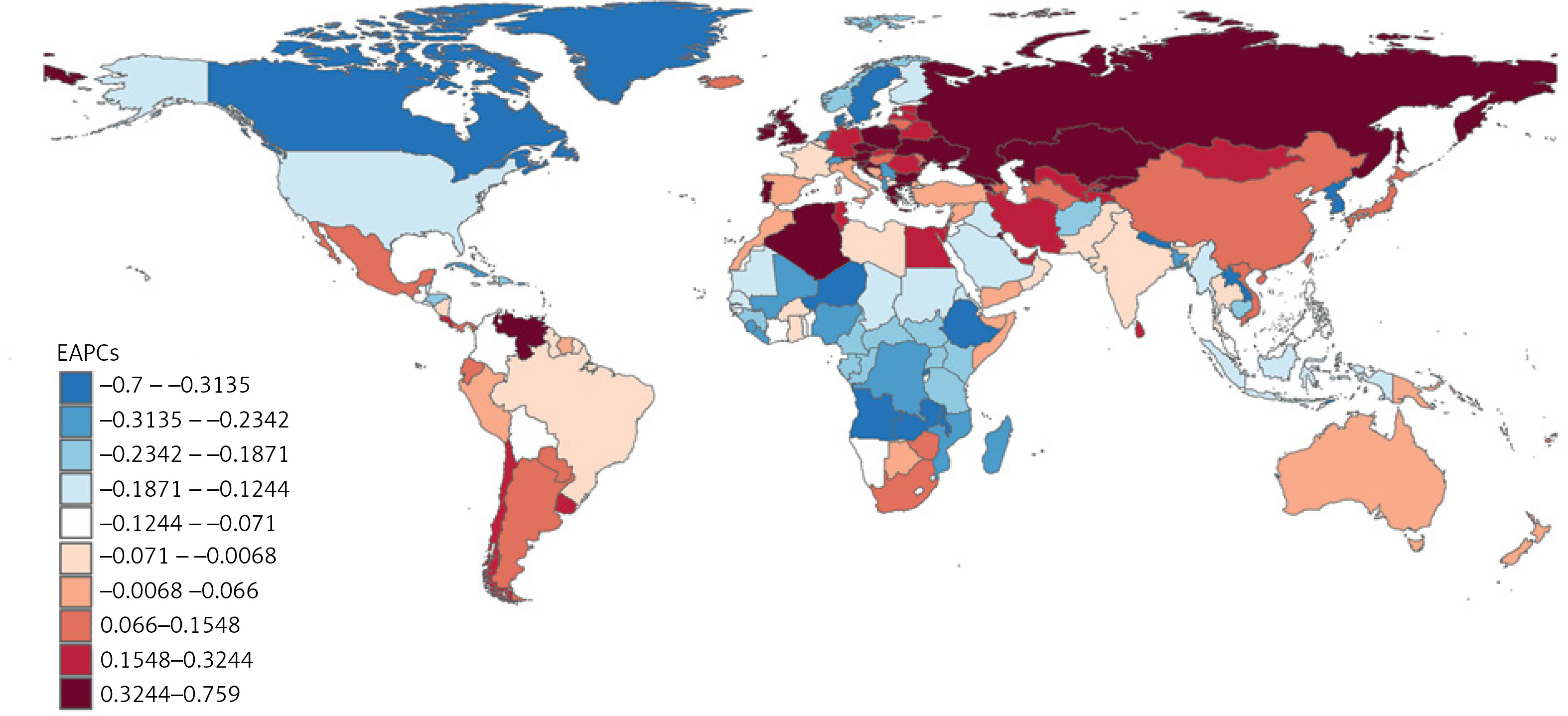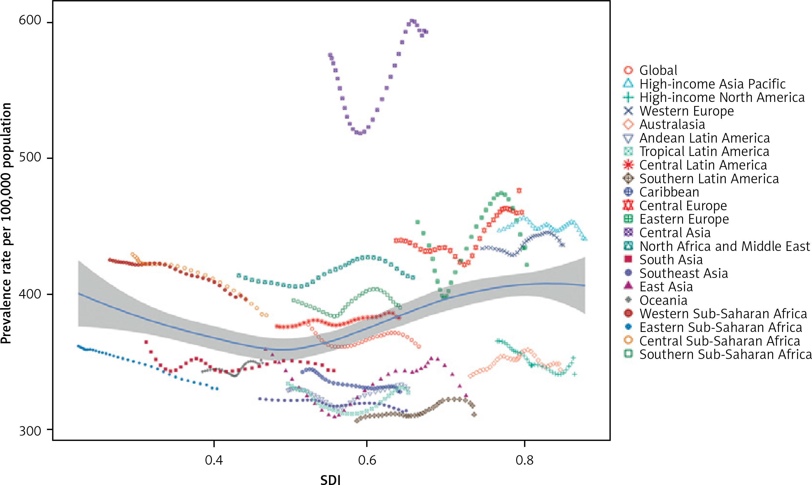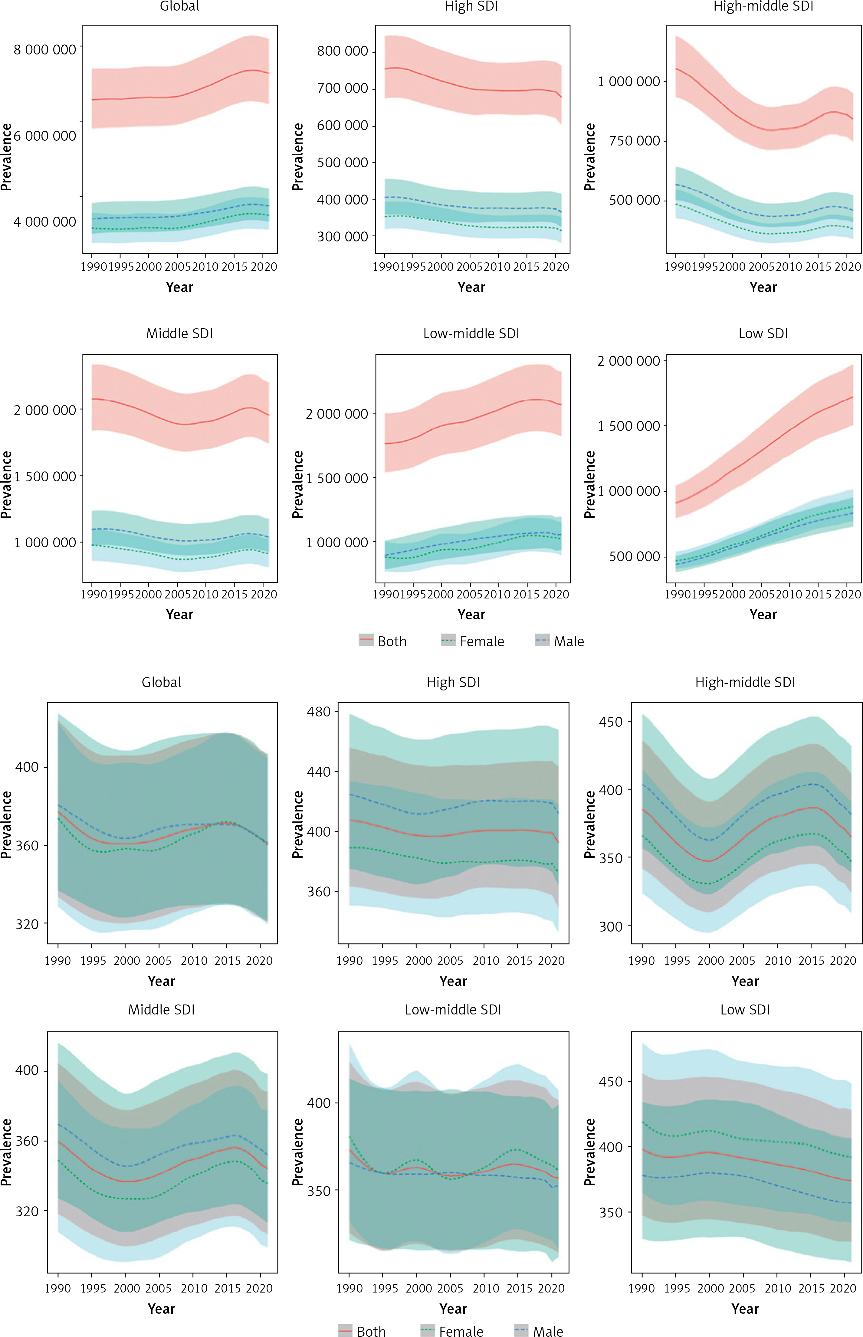In 2021, the low-middle-SDI group had the highest number of cases of CHAs in children (2,068,011 cases; 95% UI: 1,819,242–2,328,074). The greatest decrease in the prevalence of CHAs among children was observed in the low-SDI group (EAPC = –0.177; 95% CI: –0.205 to –0.149) (Table I, Figure 2).