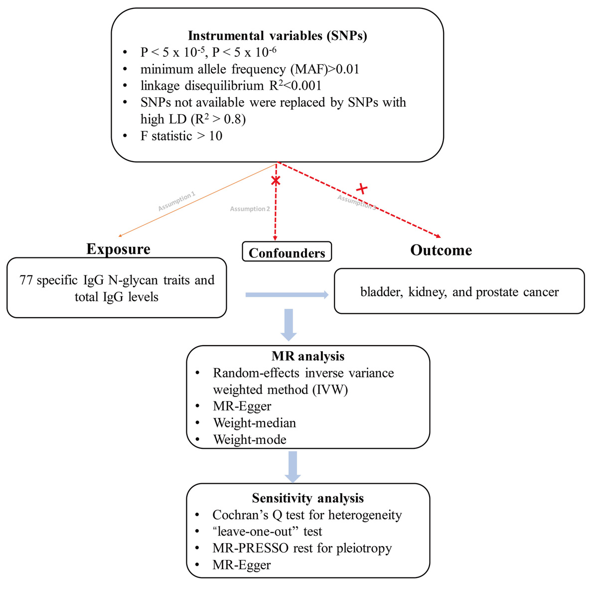 Urological cancers pose a significant global health burden. Alterations in immunoglobulin G(IgG) N-glycosylation are implicated in cancer pathogenesis, but their causal role remains unclear. This study aimed to explore the potential causal associations between 77 specific IgG N-glycan traits (IGPs) and the risks of bladder, kidney, and prostate cancer.
