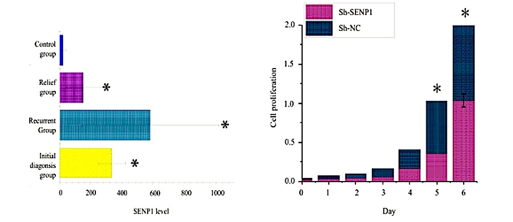 The expression of SENP1 from low to high was the controls, the initial diagnosis subjects, the remission subjects, and the recurrence subjects. The incidence of adverse conditions was the lowest in the initial diagnosis subjects, followed by the remission subjects and the recurrence subjects. The proliferation of U937 decreased after SENP1 knockdown, suggesting that SENP1 has a major role in AML cell multiplication. In addition, the apoptosis rate of U937 was increased after SENP1 knockdown. The overall survival (OS) and disease-free survival (DFS) were ranked as: recurrence subjects < initial diagnosis subjects < remission subjects < controls.