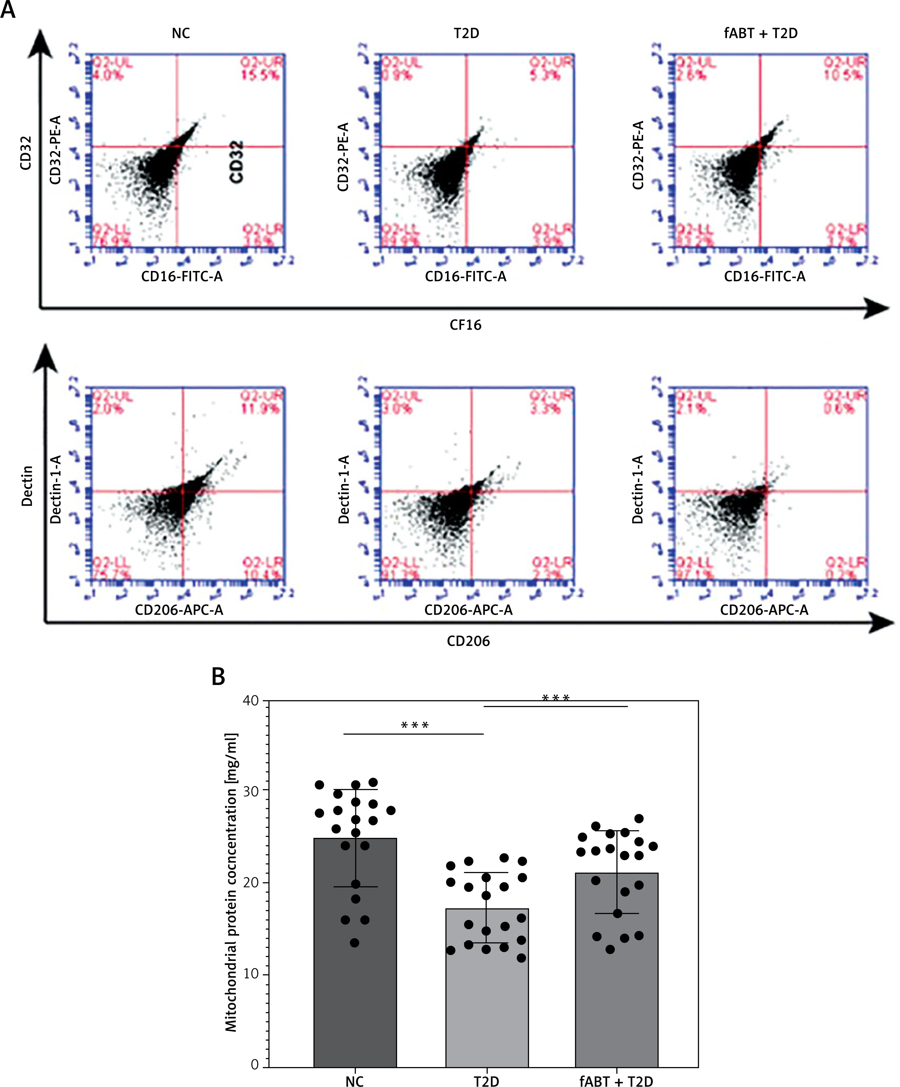 Although some studies have reported no significant adverse effects of transfusing red blood cells in patients undergoing treatment or operations, recent studies have indicated the adverse impact of old red blood cell transfusions [8, 29]. We tested the effect of fABT in diabetic mice and found that it reduced M2 macrophage polarization over M1 compared to the negative control and diabetes groups (Figure 1 A). Noting that different fluid resuscitation impacts hepatic mitochondria [15], we found that fABT significantly improved hepatic mitochondria in diabetic mice compared to the negative control and diabetes groups (Figure 1 B).