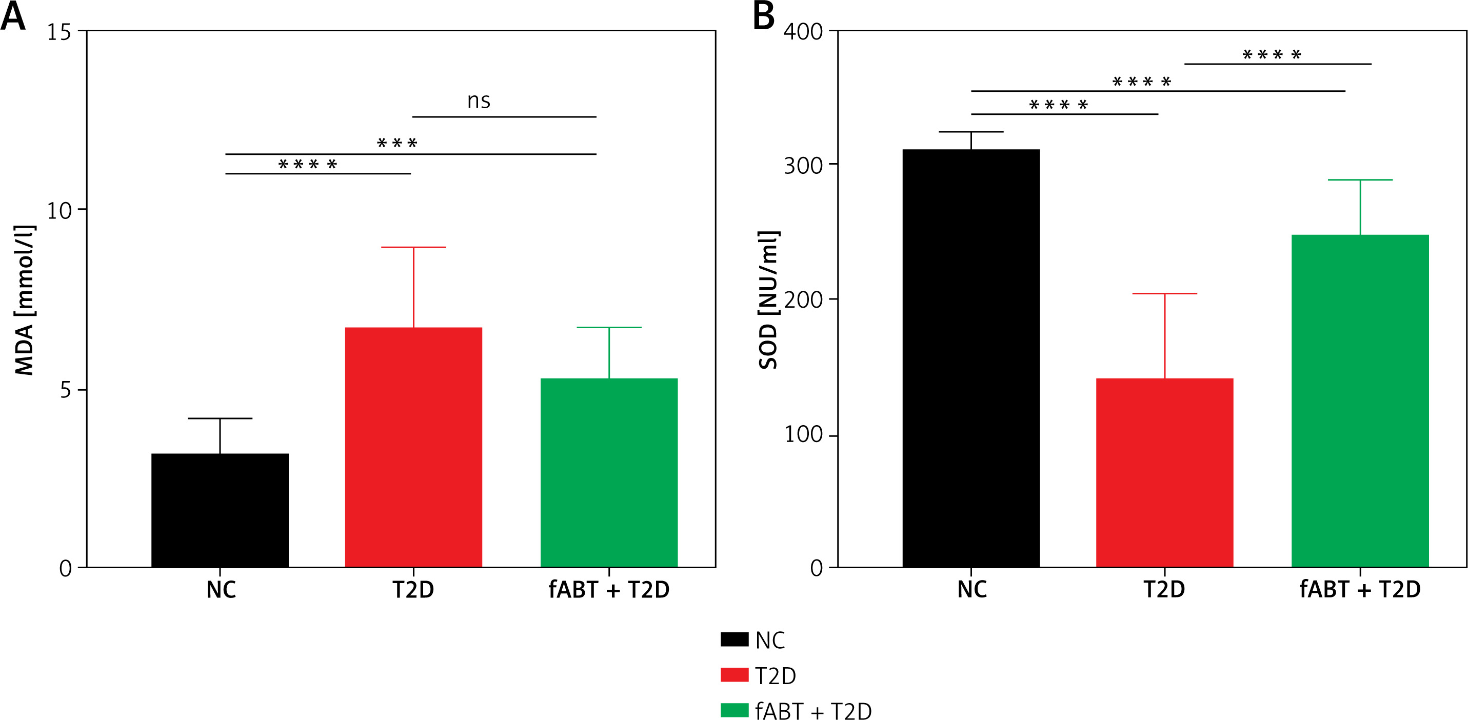 It is known that storing red blood cells alters their oxidative processes [29, 30]. Such processes have unique markers to determine their oxidative stress status, superoxide dismutase (SOD) and malondialdehyde (MDA) [31]. The results showed that fABT decreased MDA levels (Figure 2 A) and improved the level of SOD (Figure 2 B) compared to the T2D and NC groups. These results suggest that fABT is advantageous for sustaining protection against red blood cell oxidative stress.