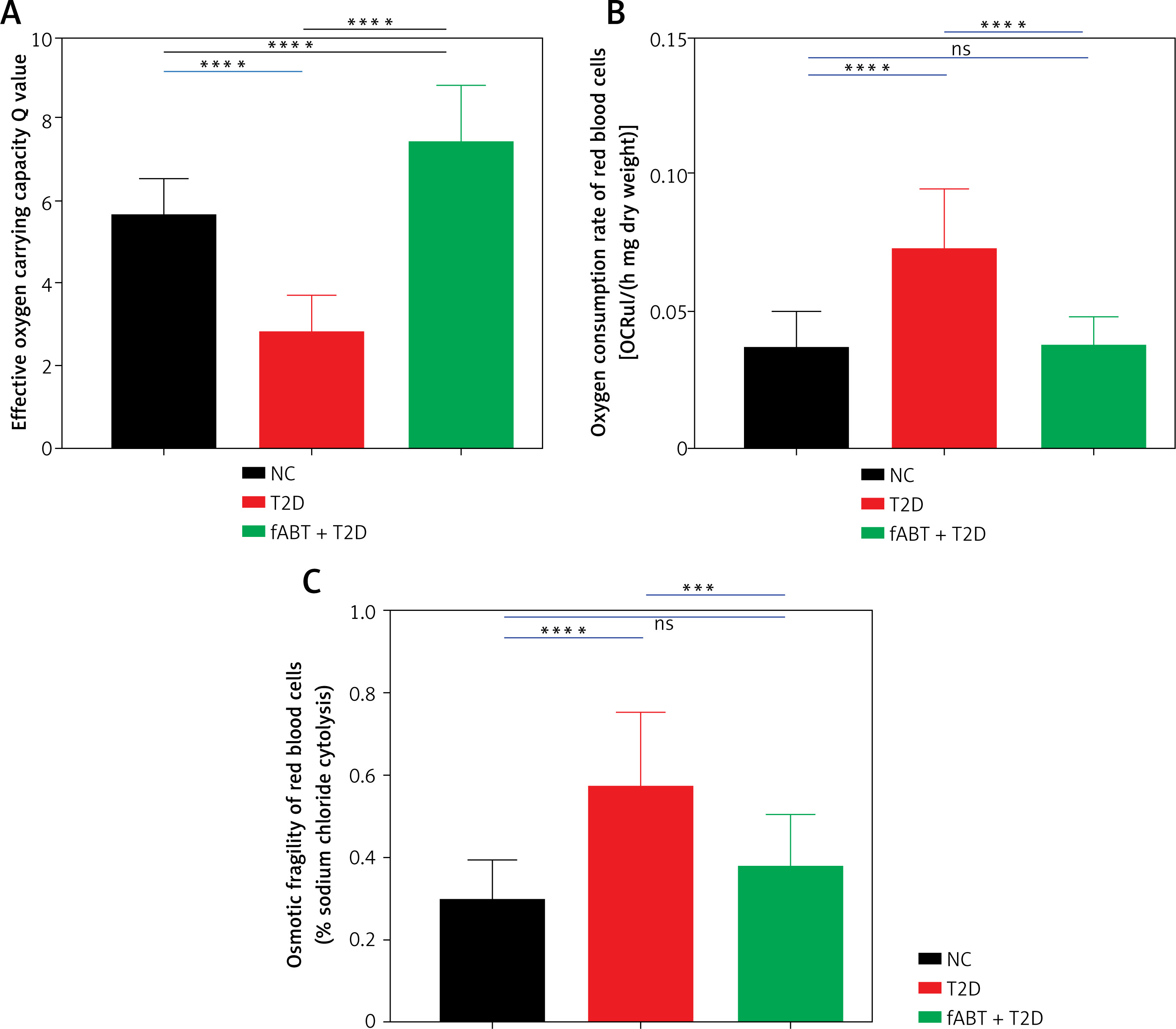 The abovementioned results confirmed the vital role of fABT in the biological functions in diabetic mice; therefore, we determined the erythrocyte functions in diabetic mice after receiving fABT. Our data showed that fABT enhanced the oxygen-carrying capacity of erythrocytes (Figure 4 A) and reduced oxygen consumption (Figure 4 B) and osmotic fragility (Figure 4 C) compared to the T2D group. These results confirmed the vital effects of fABT on erythrocyte functions and various biological processes, such as in diabetic mice.