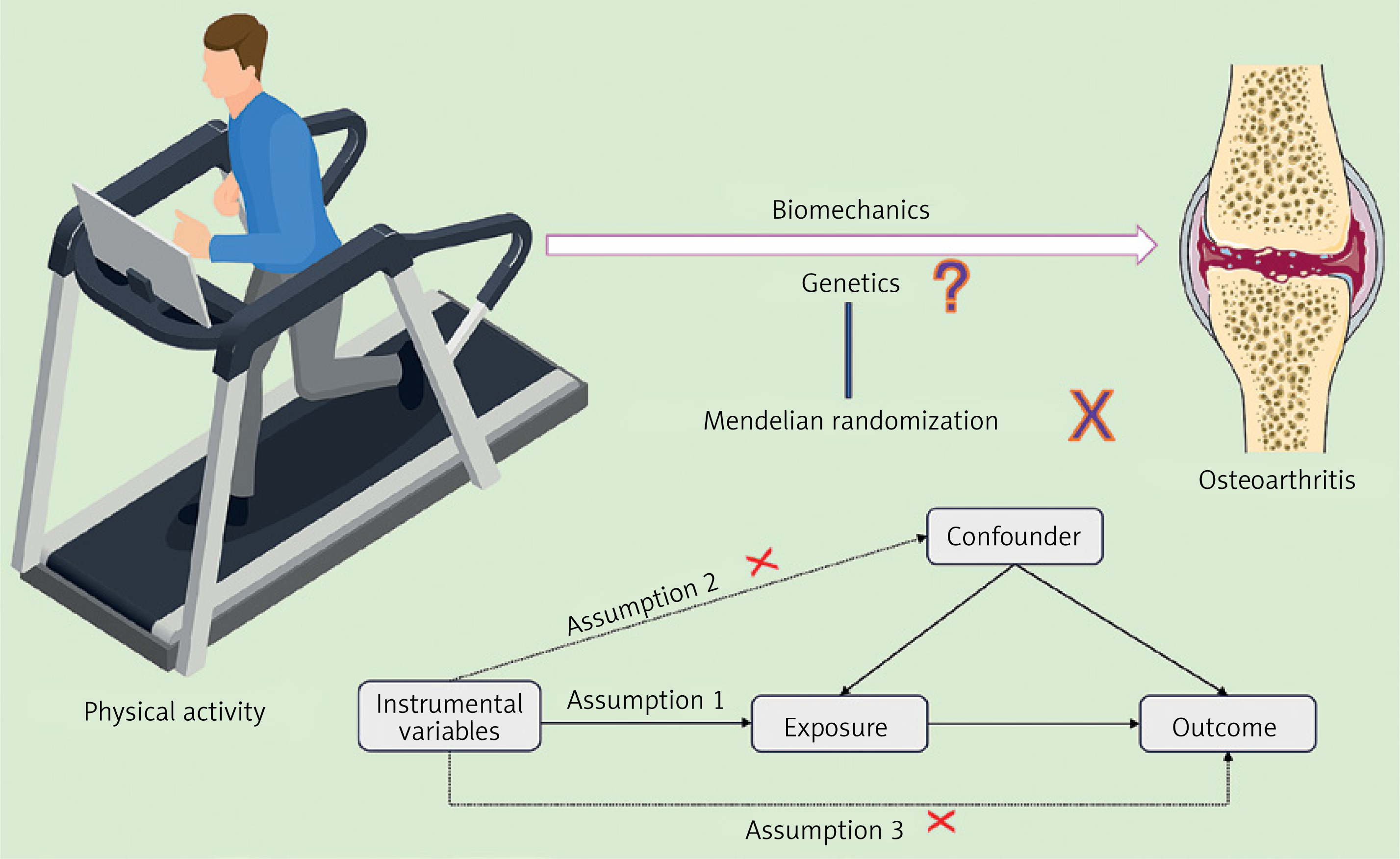 Physical activity (PA) is associated with numerous health benefits, including improved skeletal muscle density and reduced risks of cardiovascular and cerebrovascular diseases, hypertension, type 2 diabetes, lipid disorders, and various cancers [12]. PA helps mitigate age-related physiological decline through several mechanisms. It enhances muscle strength and mass, optimizes joint load distribution, increases basal metabolic rate and bone density, reduces body fat and cardiovascular risk factors, and improves endothelial, cognitive, and mental functions [13]. Recent studies suggest that moderate PA may help prevent OA and relieve its symptoms, whereas excessive long-term PA may increase OA risk [14–16]. However, the observational nature of these studies limits causal inference due to potential confounding factors such as sex, age, environment, and sampling bias [17]. Thus, building on previous findings, further investigation is needed to clarify the causal relationship between PA and OA [14–16].