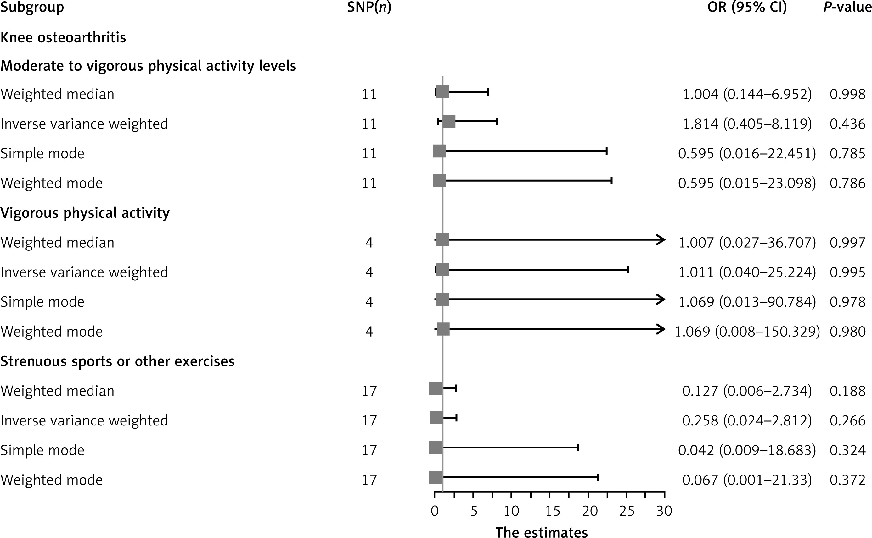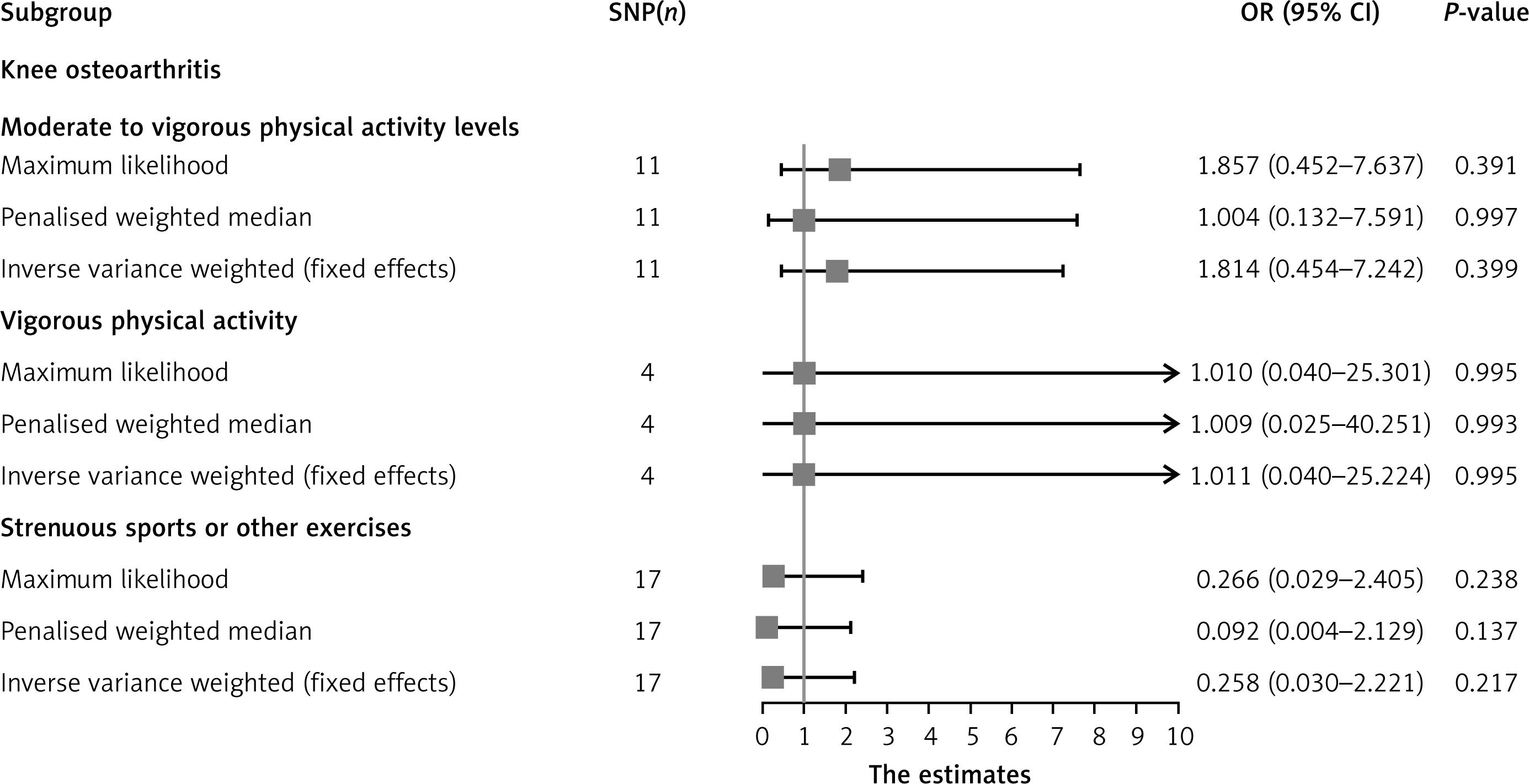 We identified 11, 4, and 17 SNPs strongly associated with MVPA, VPA, and SSOE, respectively, for use as IVs in the MR analysis of KOA. None of these SNPs showed associations with KOA or potential confounders. All selected SNPs had F statistics > 10, met the criteria for valid instrumental variables, and were non-palindromic (Supplementary Tables SII–SIV).