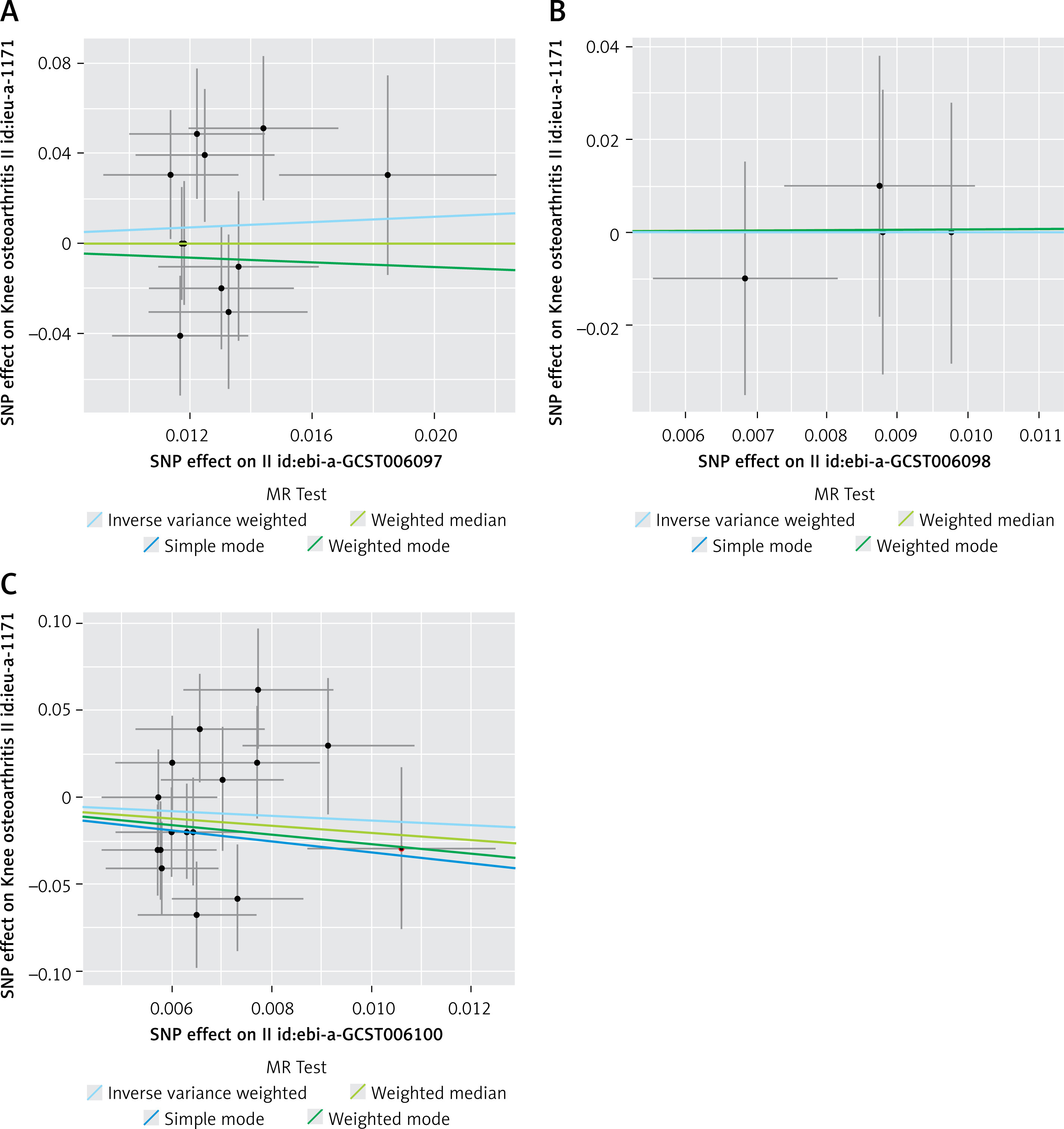 The results of the random-effects IVW analysis indicated that there was no significant genetic causal relationship between MVPA (p = 0.436, odds ratio [OR] = 1.814, 95% confidence interval [CI] [0.405–8.119]), VPA (p = 0.995, OR = 1.011, 95% CI [0.040–25.224]), SSOE (p = 0.266, OR = 0.258, 95% CI [0.024–2.812]), and KOA. The findings from the weighted median, simple mode, and weighted mode analyses were consistent with those of the random-effects IVW analysis (p > 0.05) (Figures 2, 3). Finally, the maximum likelihood, penalized weighted median, and IVW (fixed effects) analyses indicated no genetic causal relationship between MVPA, VPA, and SSOE, and KOA (p > 0.05) (Figure 4).