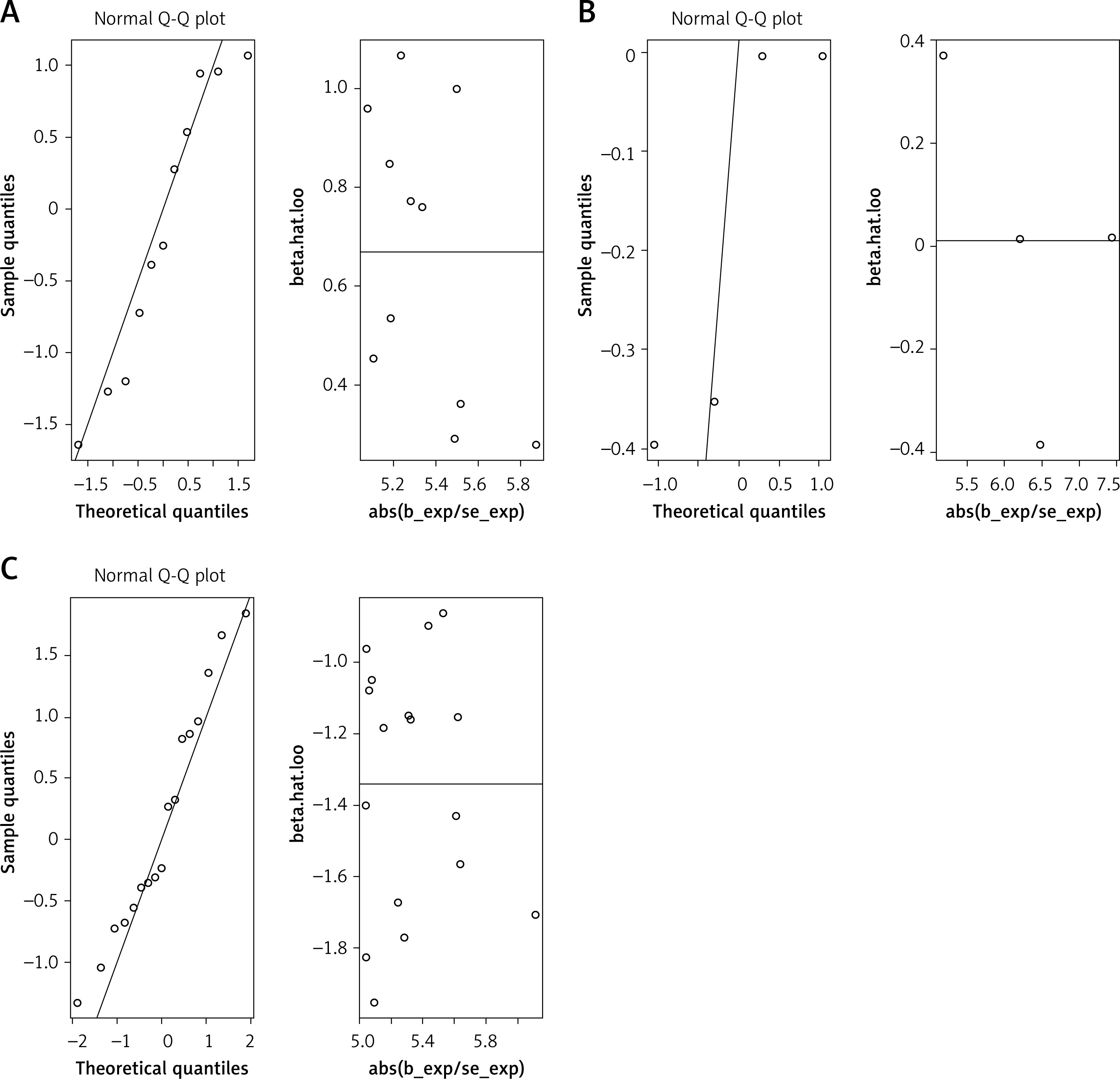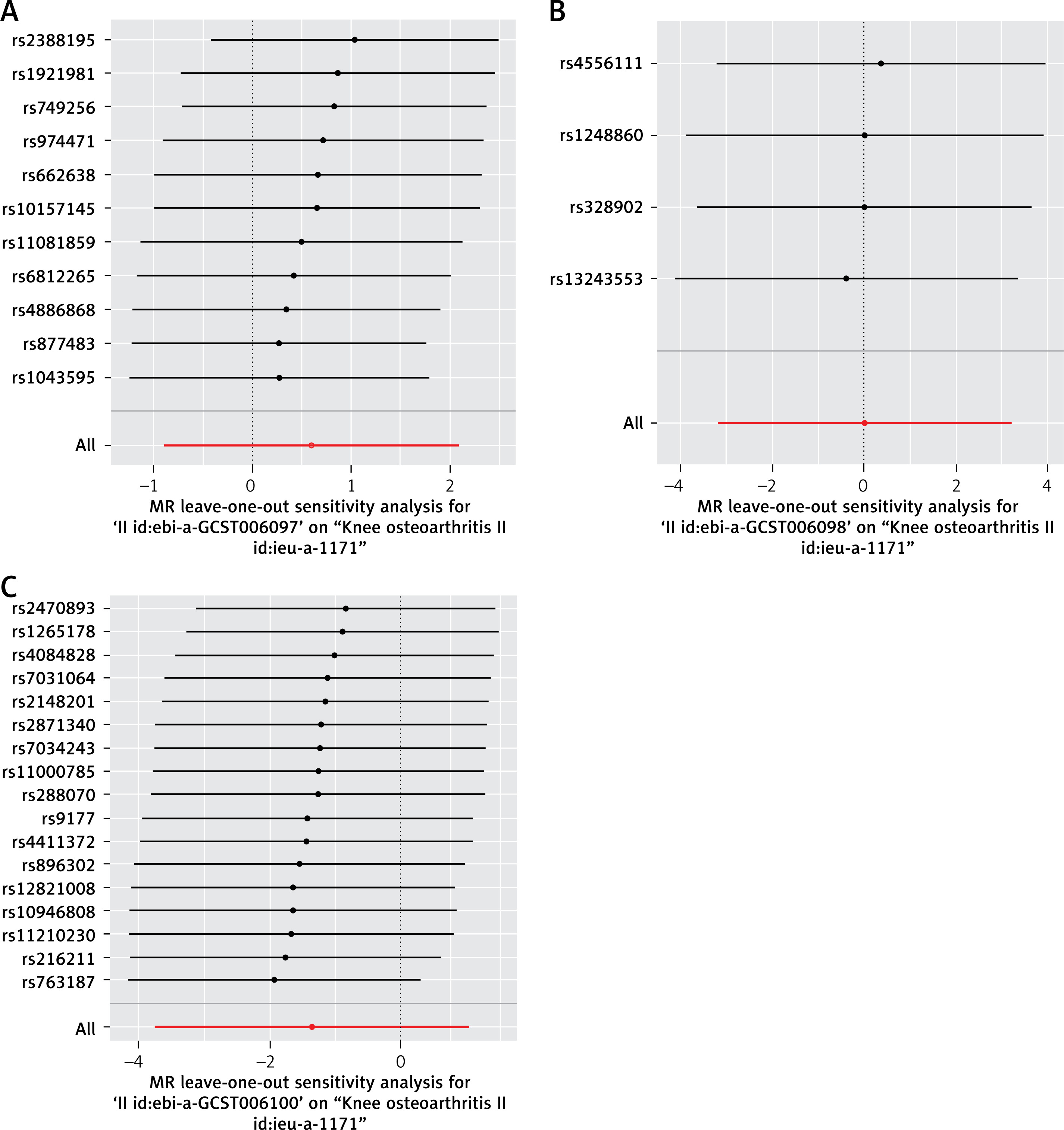 Cochran’s Q statistic of MR-IVW revealed no heterogeneity in the MR analysis of MVPA (p = 0.304), VPA (p = 0.963), SSOE (p = 0.234), and KOA. Similarly, Rucker’s Q statistic of MR Egger indicated no heterogeneity in the MR analysis of MVPA (p = 0.304), VPA (p = 0.927), SSOE (p = 0.280), and KOA. The intercept test of MR Egger demonstrated no horizontal pleiotropy in the MR analysis of MVPA (p = 0.595), VPA (p = 0.753), SSOE (p = 0.211), and KOA. Additionally, the global test of MR-PRESSO analysis showed no horizontal pleiotropy in the MR analysis of MVPA (p = 0.302), VPA (p = 0.968), SSOE (p = 0.229), and KOA. The outlier test of MR-PRESSO analysis revealed no outliers in the MR analysis of MVPA, VPA, and SSOE, and KOA (Table I). Furthermore, the leave-one-out analysis demonstrated that the MR analysis results of MVPA, VPA, and SSOE, and KOA were not driven by a single SNP (Figure 5). Additionally, the MR-RAPS analysis showed that the MR analysis between MVPA, VPA, and SSOE, and KOA were normally distributed (p > 0.05) (Table I, Figure 6). However, no P-value was given for the MR-RAPS analysis of VPA and KOA because only four IVs were available, and MR-RAPS requires seven or more IVs to provide a p-value.