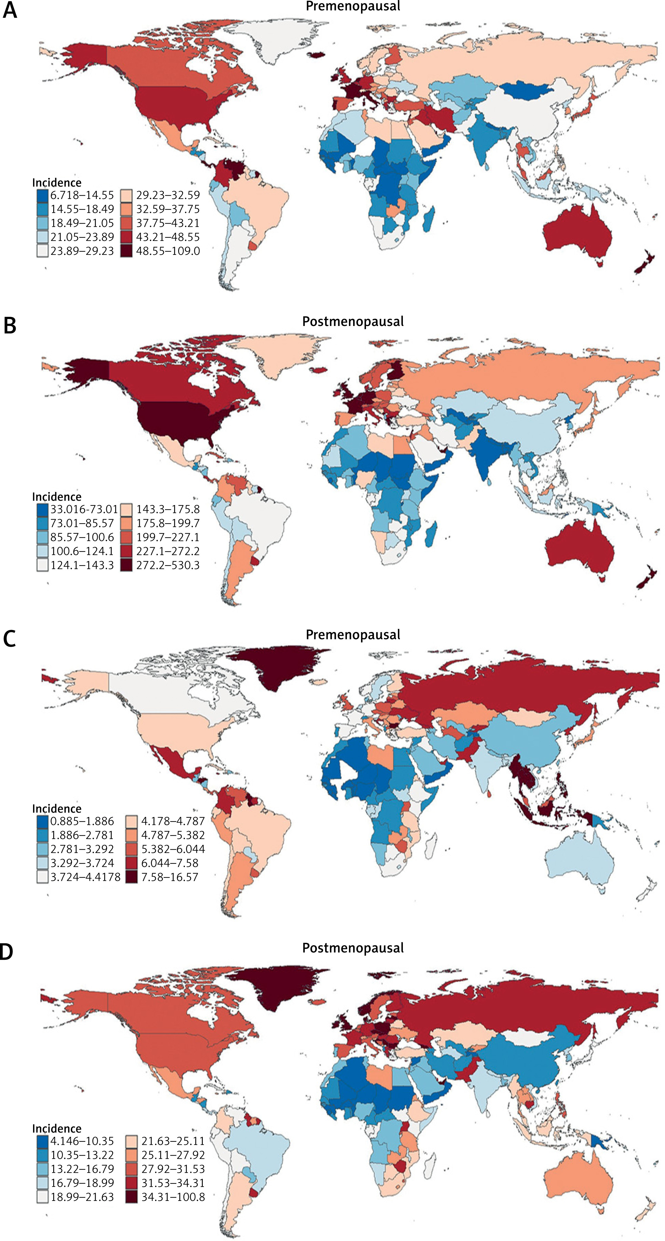 In 2021, the incidence of breast cancer, shows a correlation with SDI, with higher SDI regions experiencing a greater proportion of pre- and post-menopausal cases. The ASIR for both pre- and post-menopausal breast cancer were highest in regions with high SDI. Globally, there were 2,082,736 new female breast cancer cases, with an ASIR of 27.51 (95% UI: 25.46–29.75) for premenopausal and 150.30 (95% UI: 135.72–162.45) for postmenopausal cases (Table I). This led to 129,406 deaths among premenopausal and 531,520 deaths among postmenopausal women (Table I). In 21 GBD regions and 204 countries, premenopausal ASIR peaked in High-income North America (47.20) and Monaco (109.01), postmenopausal in High-income North America (328.03) and United Arab Emirates (530.29; Figures 1 and 2). Premenopausal age-standardized DALY rates and ASMR were highest in Oceania and Nauru, postmenopausal in Southern Sub-Saharan Africa and United Arab Emirates (Figure 1, Supplementary Figures S1, S3 and S4).