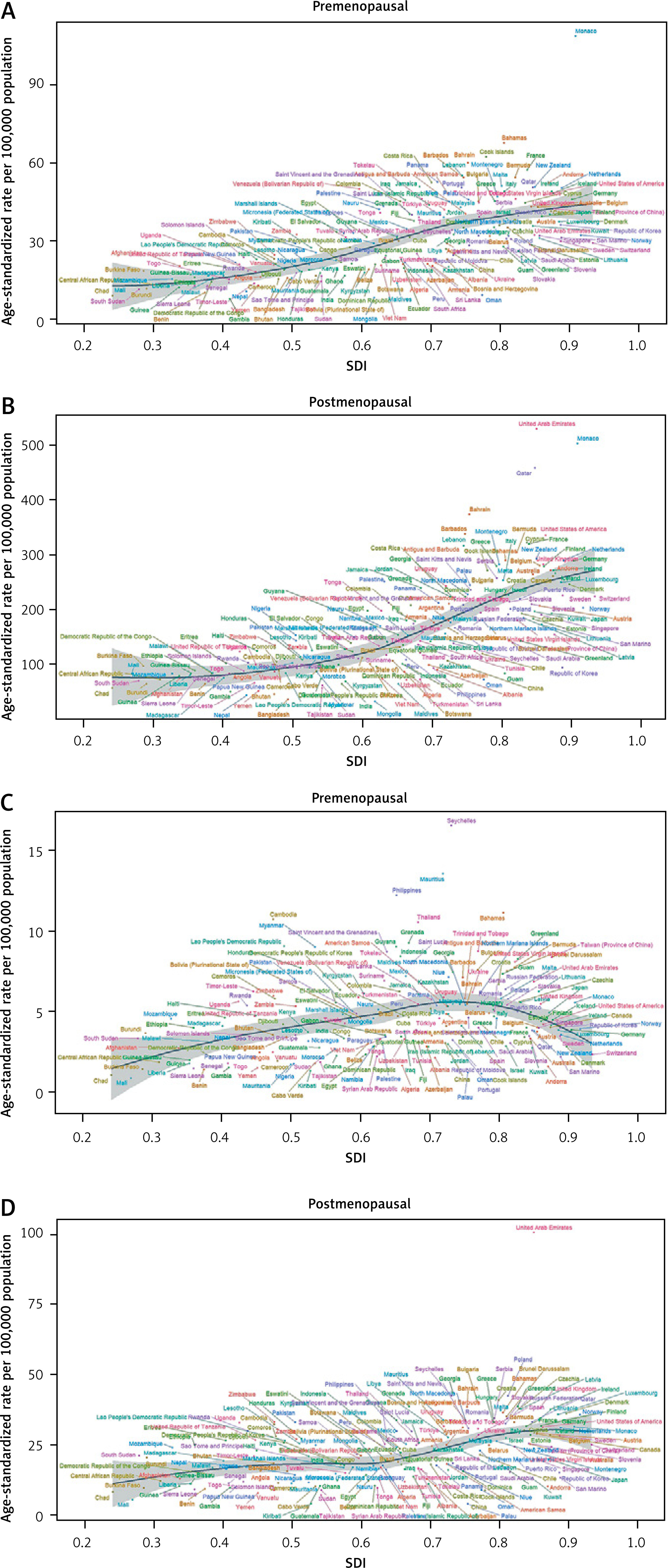 Between 1990 and 2021, global ASIR for both pre- and post-menopausal breast cancer rose, with the EAPC of 0.50% for premenopausal and 0.36% for postmenopausal cases (Table I). Over three decades, there was a global downward trend in age-standardized DALY rates and ASMR for both groups. For premenopausal women, the age-standardized DALY rate decreased by an EAPC of –0.38%, and ASMR by –0.47% (Table I). Postmenopausal women experienced a more pronounced decline, with age-standardized DALY rates falling by -0.50% and ASMR by –0.57% EAPC (Table I, Supplementary Table SI). Apart from the High SDI region, the incidence of breast cancer has increased in all other SDI regions, for both pre- and post-menopausal women. Across the regional and national levels, the most rapid increases of ASIR for both pre- and post-menopausal women were observed in North Africa and Middle East, Turkey (Supplementary Figure S2). The steepest declines in both ASMR and age-standardized DALY rates for premenopausal women were noted in Western Europe. Conversely, the most significant reductions for postmenopausal women were seen in Australasia and High-income North America (Supplementary Figures S1 and S2).