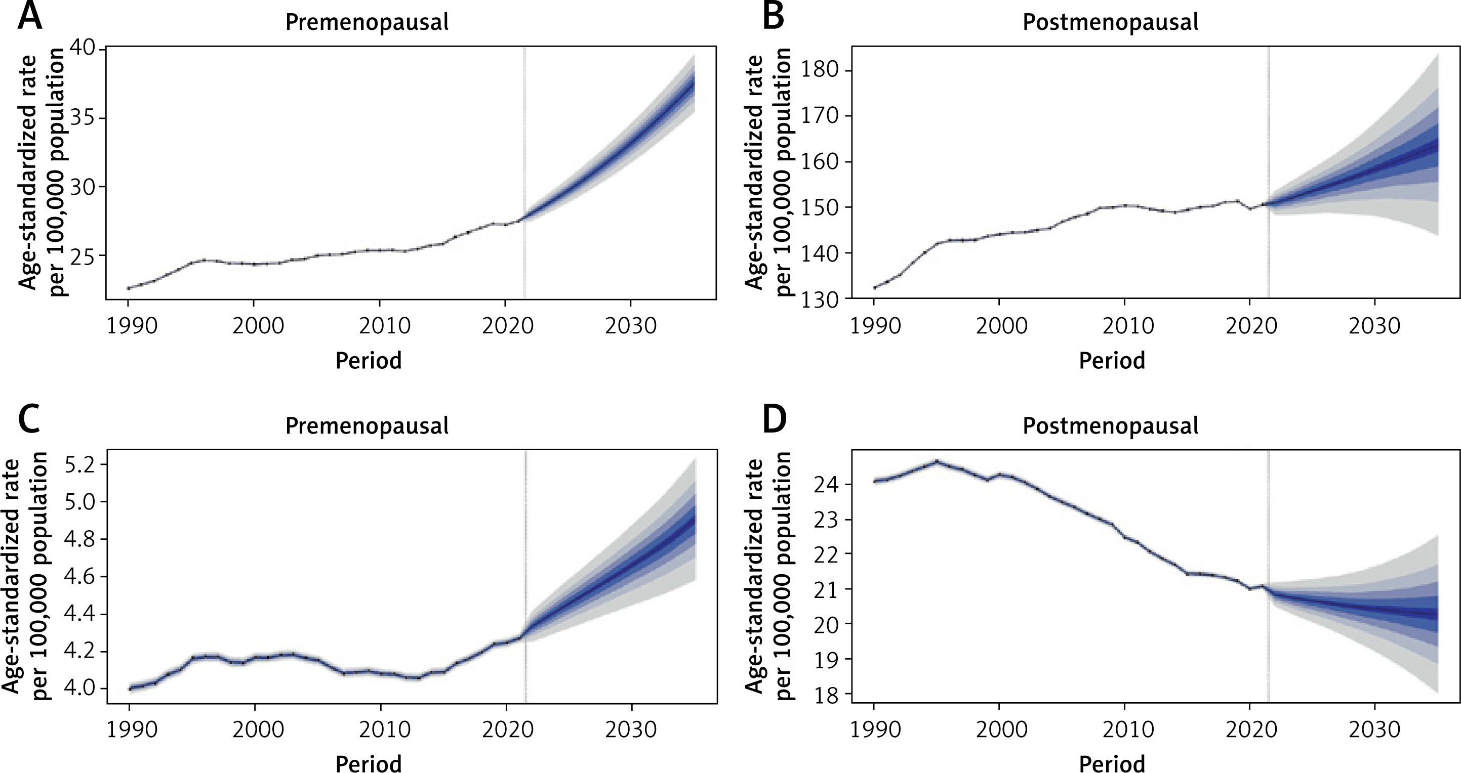 Menopause is not merely an age milestone but a fundamental biological watershed that dramatically alters the endocrine environment [42]. Our findings robustly confirm that pre- and post-menopausal cancers are, in effect, distinct epidemiological entities. This stark dichotomy underscores that the driver of these trends is likely different: for premenopausal women, factors may include shifting reproductive patterns and early-life exposures, whereas for postmenopausal women, the effectiveness of screening, hormone replacement therapy use, and advancements in treatment may be more influential. To effectively address this challenge, healthcare systems must evolve from reactive treatment models toward more predictive, preventive, and personalized approaches. A comprehensive, integrated program that spans the care continuum – from risk assessment and education to early detection and treatment – is essential. Such a program should begin with enhanced risk stratification tools that incorporate genetic, hormonal, lifestyle, and regional factors, tailored to menopausal status [43, 44]. For example, premenopausal women may benefit from early genetic counseling and regular imaging, whereas postmenopausal women might require more frequent and specialized screening modalities. Implementing digital health tools and artificial intelligence for imaging analysis could improve diagnostic accuracy and allow for scalable, region-specific screening strategies, especially in resource-variable settings. Moreover, healthcare systems should strengthen interdisciplinary collaboration among gynecologists, oncologists, radiologists, and primary care providers to facilitate seamless transitions between prevention, diagnosis, and treatment. Public health initiatives must also focus on increasing awareness of symptoms and risk factors specific to both pre- and post-menopausal populations, particularly in regions with rising incidence rates.